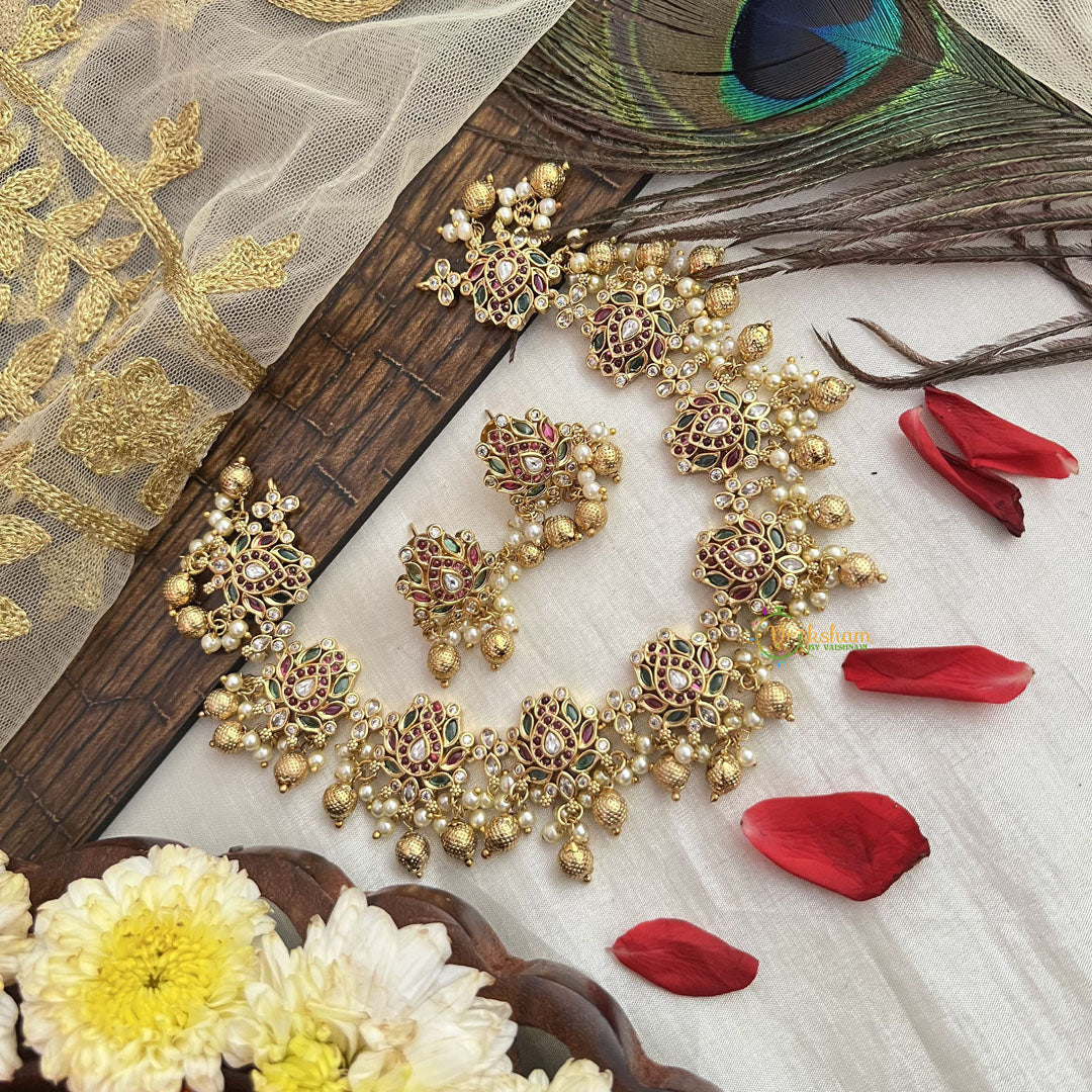 Elevate your elegance with the Vriksham Designer Lotus Gold Choker, featuring a harmonious blend of red, green, and white accents complemented by lustrous pearls. This exquisite piece captures timeless beauty and intricate craftsmanship, making it a perfect statement accessory for special occasions. Its refined design enhances any ensemble with a touch of sophistication and grace.