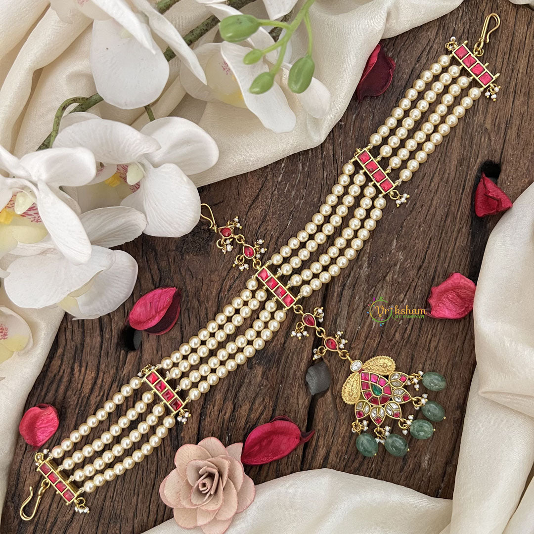 Enhance your traditional look with the Vriksham Designer Lotus & Pearl Matha Patti, adorned with a stunning Kundan Jadau drop double side Maang Tikka. This elegant accessory combines intricate lotus designs and lustrous pearls, offering a sophisticated finish that complements any festive or wedding attire with timeless beauty.