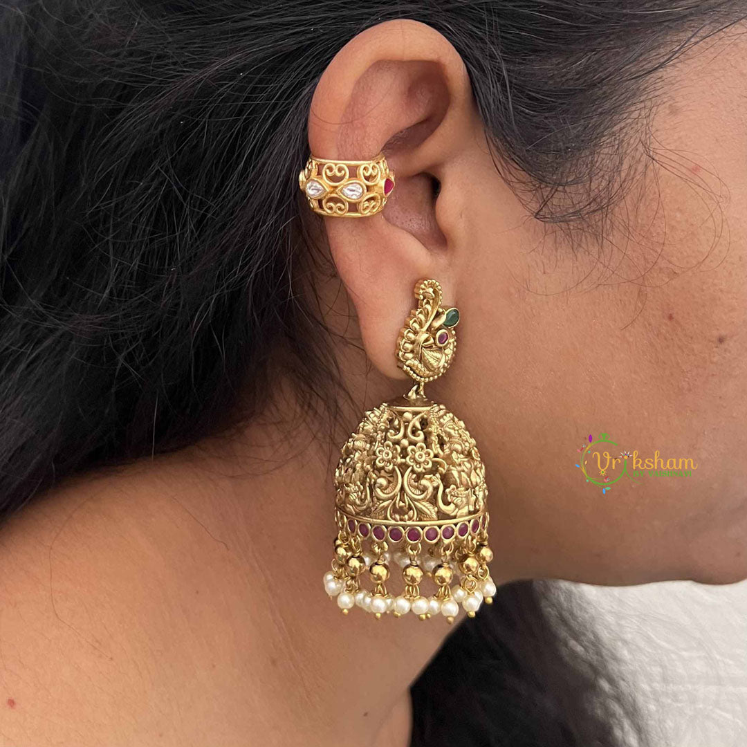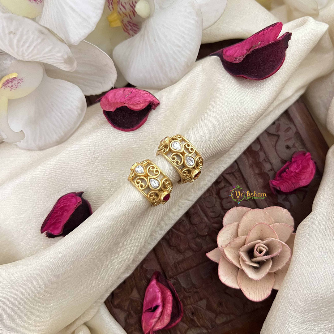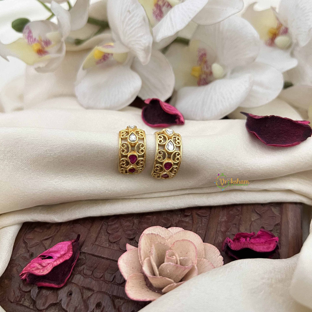 Embrace authentic regional elegance with this stunning Maharashtrian nakshi bugadi, a testament to time-honored artisanal traditions. This refined piece features exquisite nakshi craftsmanship, where skilled artisans have meticulously carved intricate patterns adorned with luminous red and pristine white gemstones. The hand-worked detailing showcases the exceptional quality and cultural authenticity that defines Maharashtrian jewelry heritage. The convenient press mechanism ensures secure, comfortable wear for all your celebrations. Ideal for weddings, festivals, and formal occasions, this bugadi represents the pinnacle of regional jewelry artistry. A treasured accessory that honors ancestral craftsmanship while radiating timeless sophistication, perfect for those who value cultural authenticity and exceptional artisanal quality.