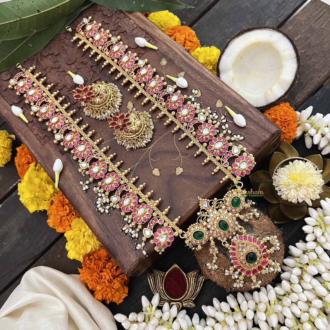The Vriksham Designer Mango Style 1 gm Gold Long Neckpiece, adorned with delicate rice pearls, showcases elegant mango motifs crafted with a fine gold finish. This lightweight neckpiece combines traditional design with refined sophistication, making it a graceful accessory to enhance any formal or festive ensemble.