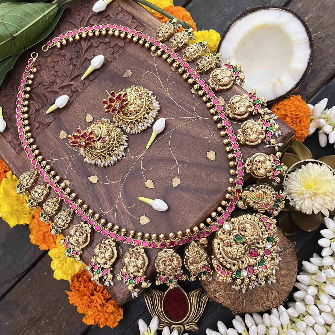 The Vriksham Designer Mango Style 1 gm Gold Long Neckpiece with Jhumka, accented by delicate rice pearls, combines traditional mango motifs with elegant jhumka detailing. This lightweight, sophisticated piece offers a graceful blend of classic design and refined craftsmanship, perfect for enhancing formal and festive attire.