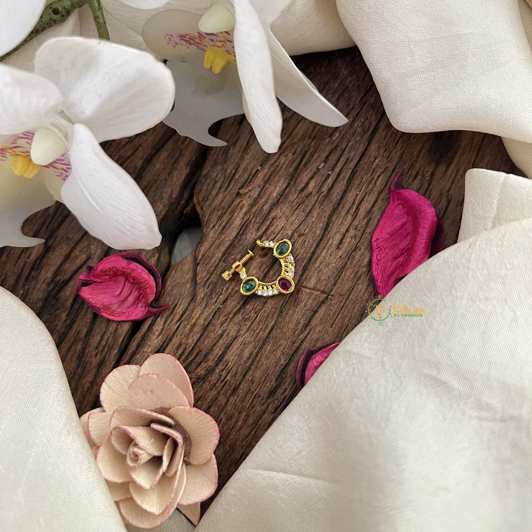 The Vriksham Designer Oval Naths features an elegant combination of red, white, and green hues in a refined oval design. Expertly crafted, this nose pin blends traditional colors with contemporary sophistication, making it a timeless accessory that adds subtle charm and grace to any ensemble.