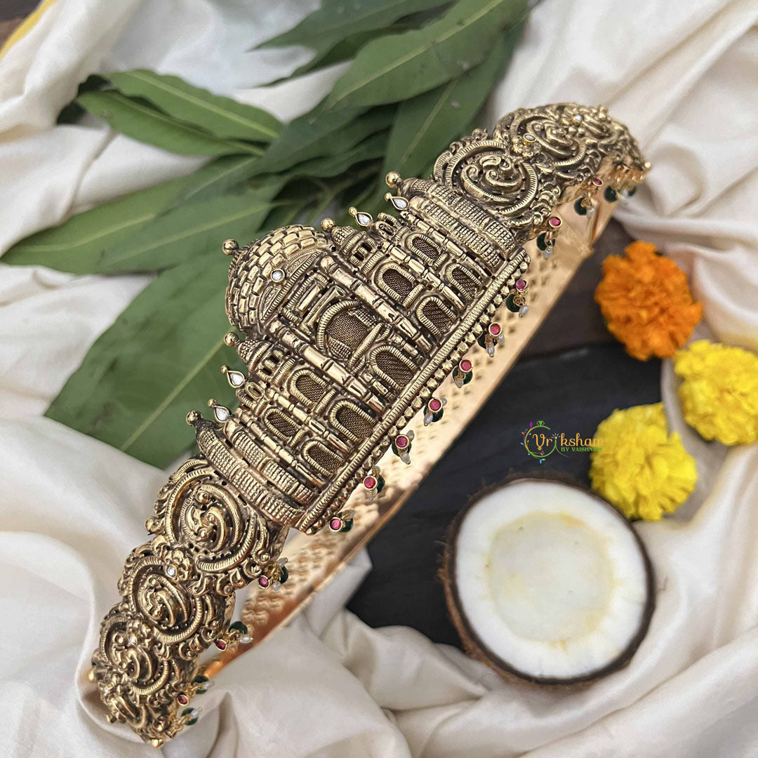 The Vriksham Designer Palace Style Hipbelt is meticulously crafted from 1 gram gold, featuring intricate palace-inspired motifs that evoke royal elegance. This sophisticated accessory enhances traditional attire with its regal charm and delicate detailing, perfect for adding a touch of grandeur to any special occasion.