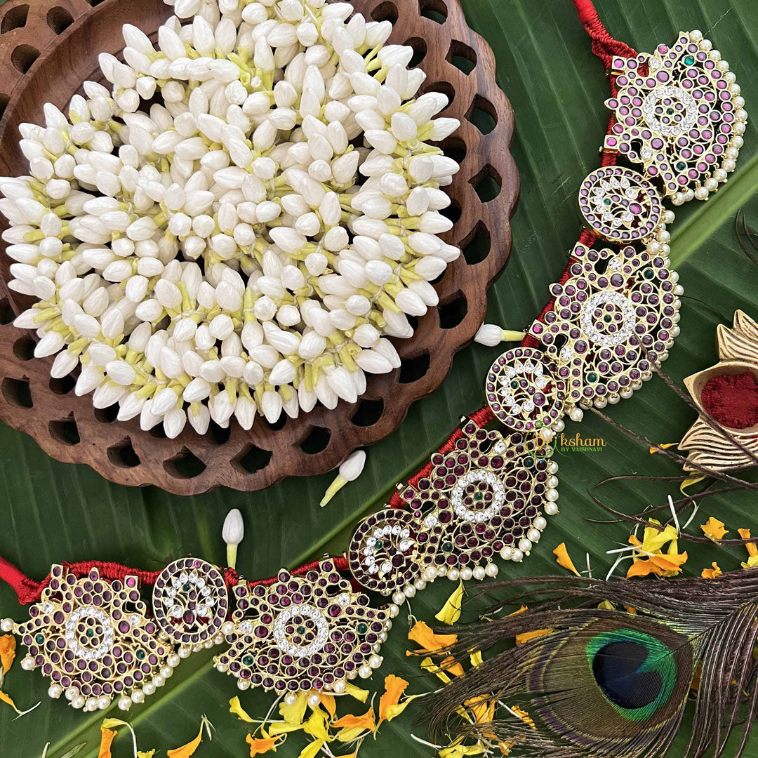 The Vriksham Designer Peacock Grace & Floral Circle Precious Kemp Hipbelt features exquisite pearl detailing with vibrant red, green, and white accents. Showcasing elegant peacock and floral circle motifs, this sophisticated hipbelt adds a refined and artistic touch to traditional attire.