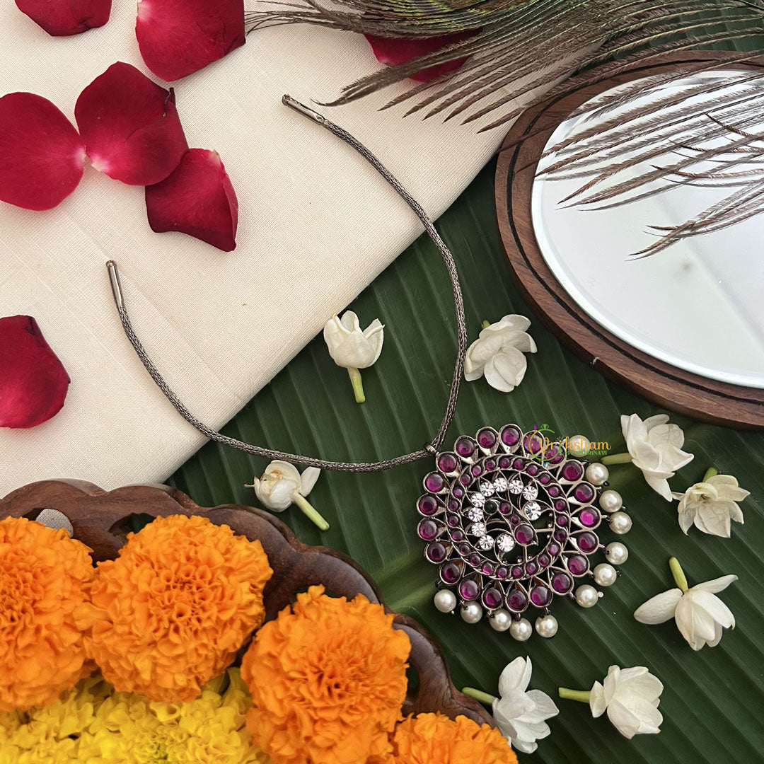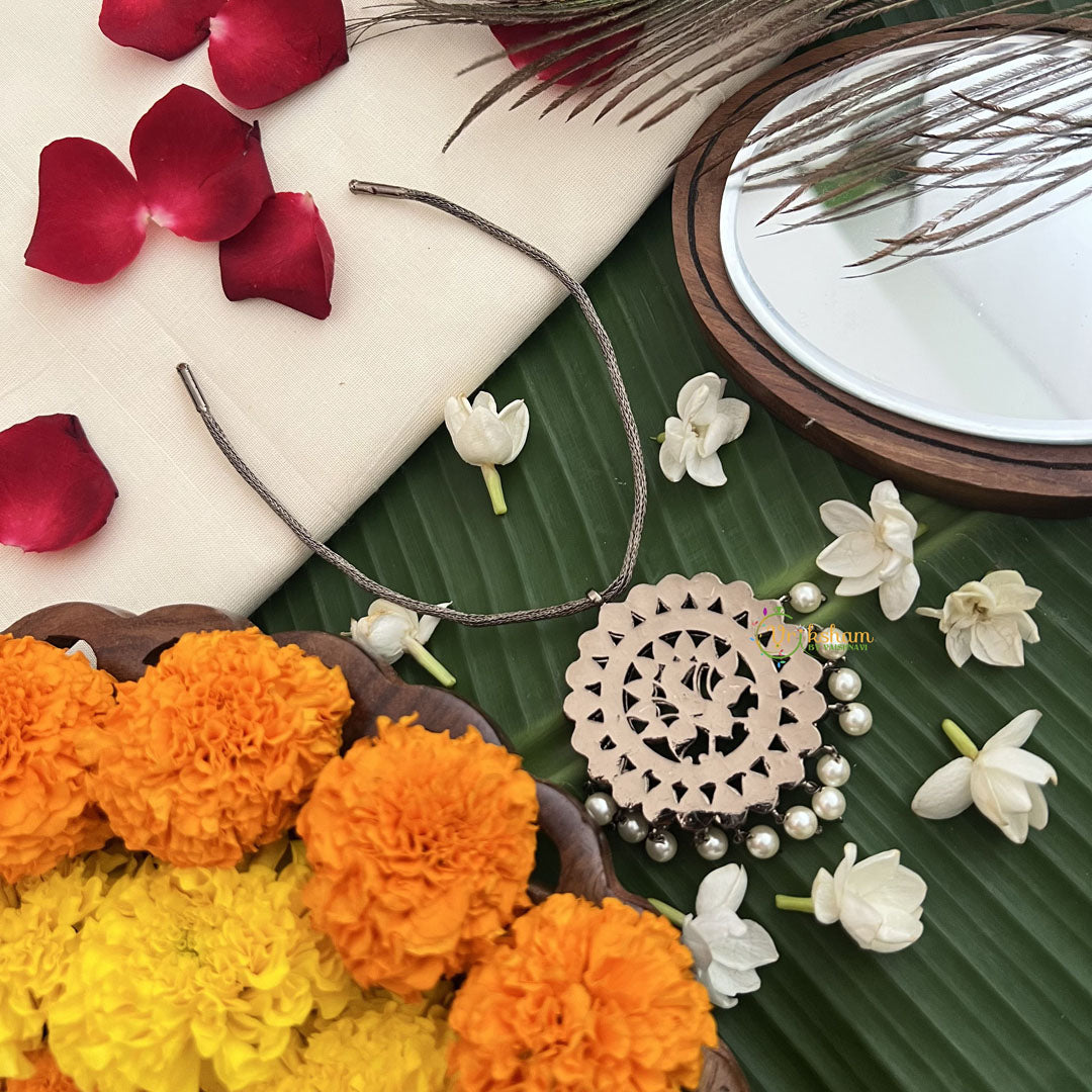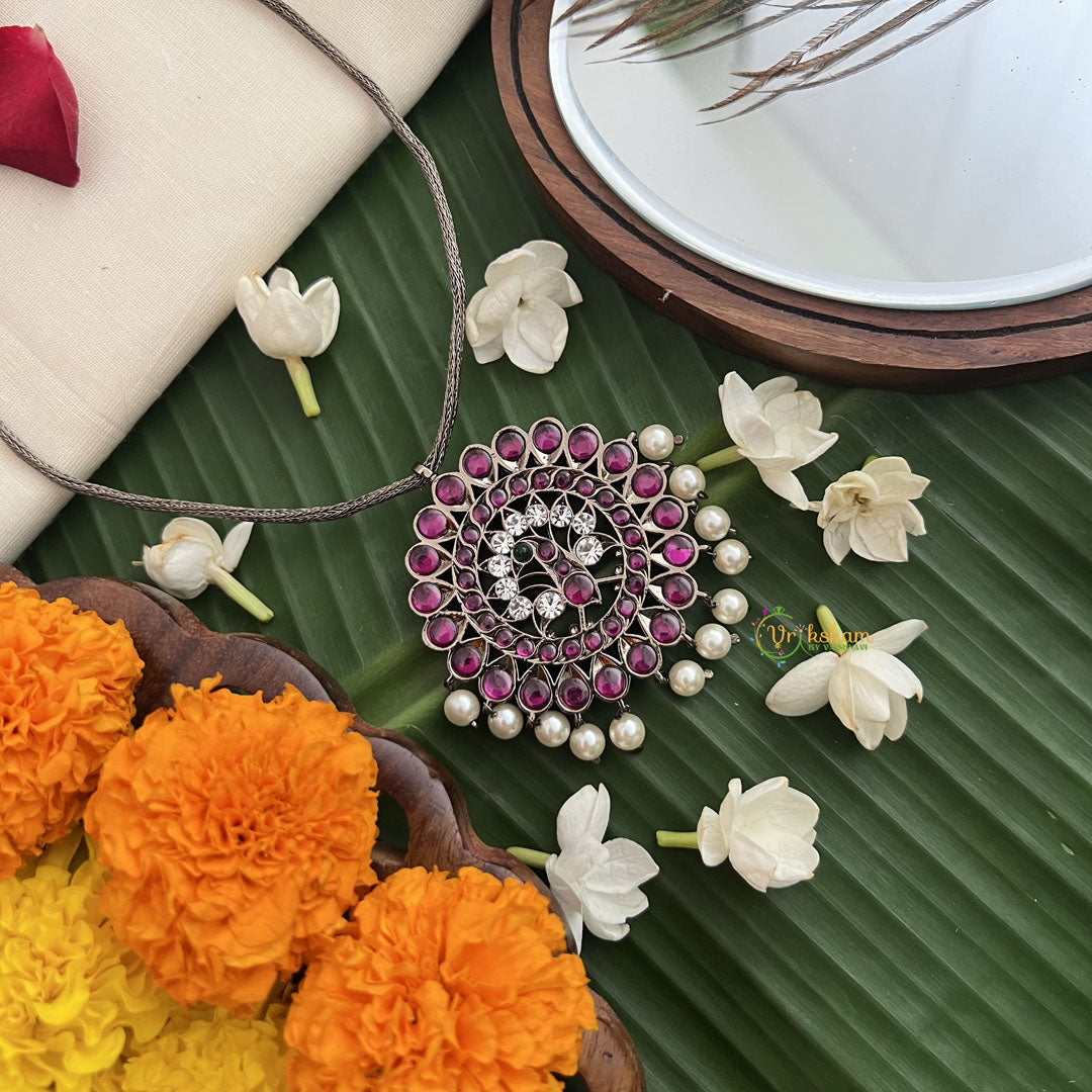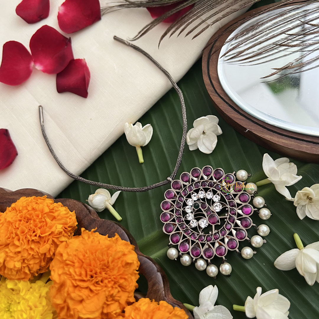 The Vriksham Designer Peacock Round Black Kemp Stone Pendant Short Neckpiece showcases a beautifully crafted peacock motif with a striking black Kemp stone centerpiece. Accented with pearls, this sophisticated neckpiece blends artistic design with elegant detailing, making it an exquisite accessory for refined traditional and contemporary ensembles.