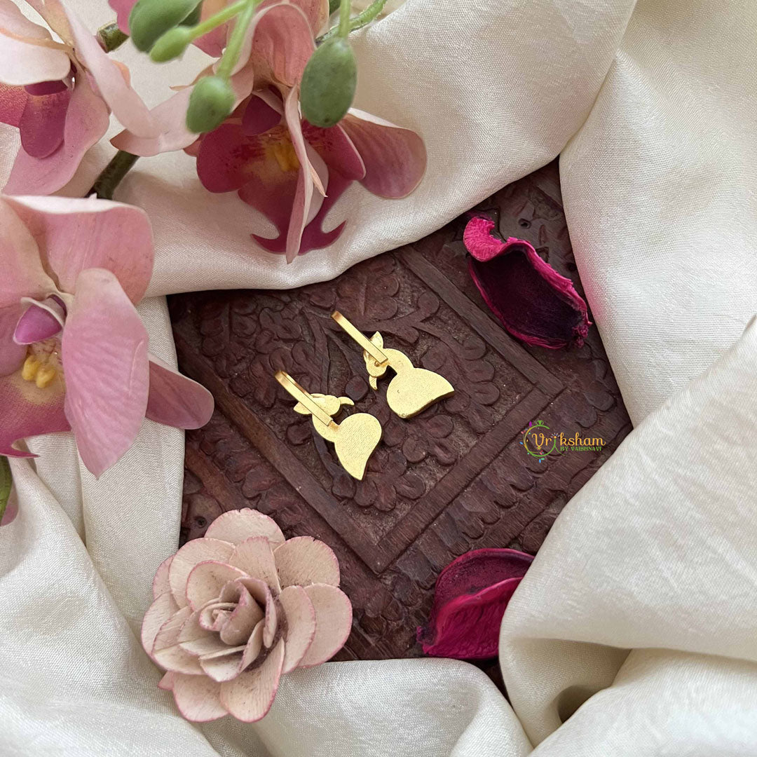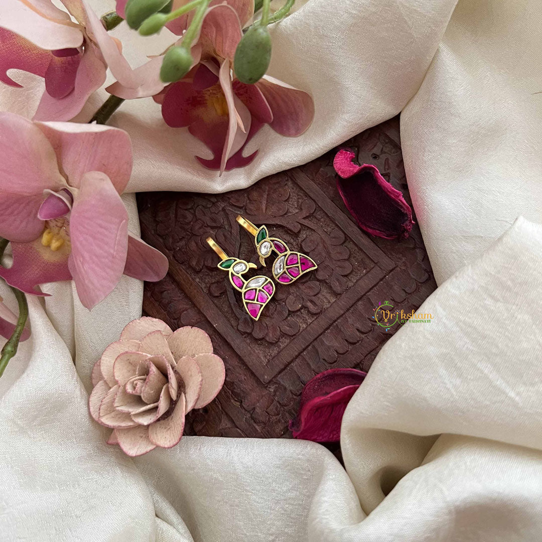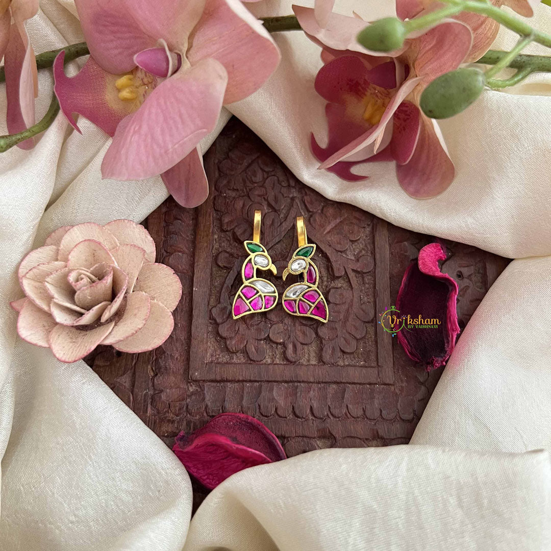 The Vriksham Designer Peacock Shape Kundan Jadau Press Bugadi features a striking peacock design crafted with precision in red, white, and green hues. This sophisticated piece combines traditional Kundan artistry with elegant detailing, making it a refined accessory to elevate any ethnic ensemble.