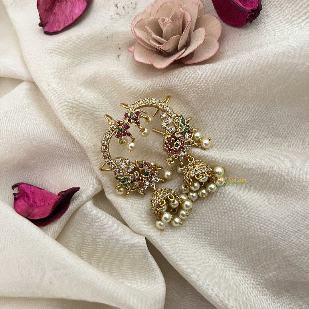 The Vriksham Designer Peacock Shaped Earcuff Earrings in Green Pearl combine intricate design with vibrant green pearls, creating a sophisticated accessory that highlights artistry and elegance. Perfect for adding a refined touch to both traditional and modern ensembles, these earrings offer a unique statement of style and grace.