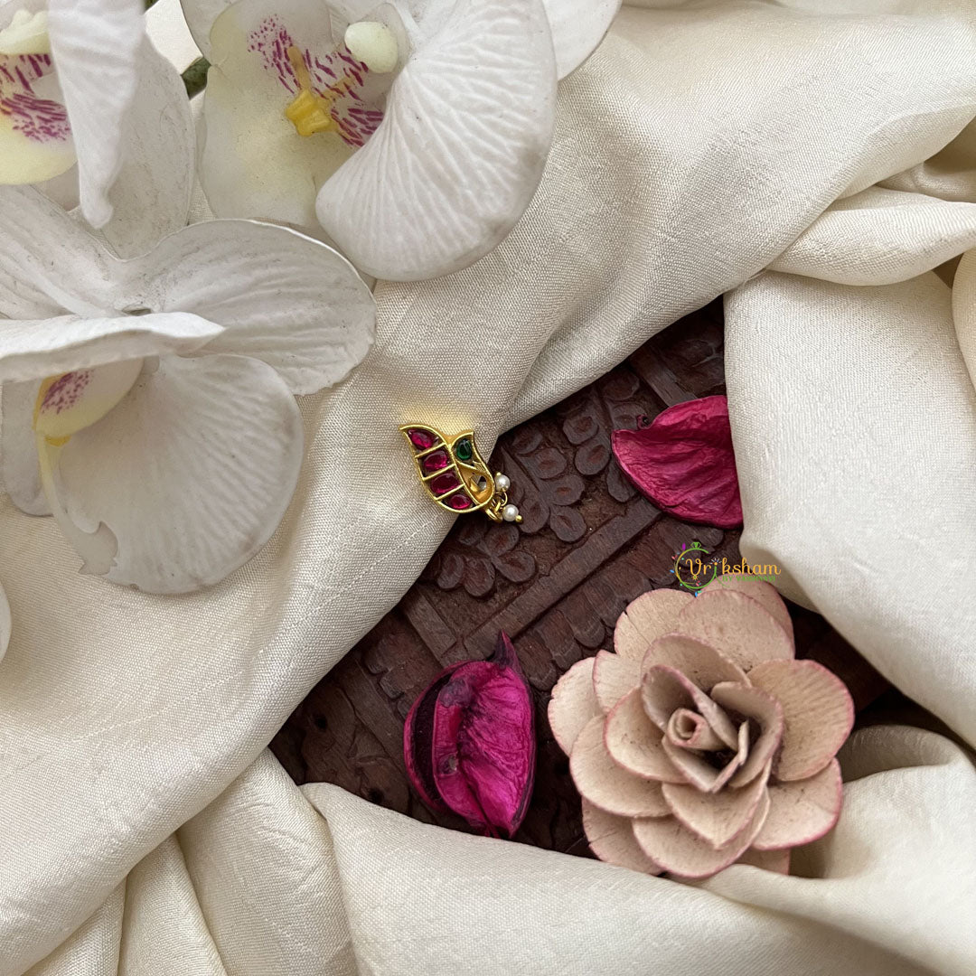 Elevate your elegance with the Vriksham Designer Peacock Style Jadau Kundan Nath. Featuring intricate left-side peacock motifs adorned with lustrous pearls and vibrant red and green accents, this exquisite piece blends traditional artistry with refined sophistication. Perfect for special occasions, it adds a graceful touch to your ensemble while showcasing timeless craftsmanship.