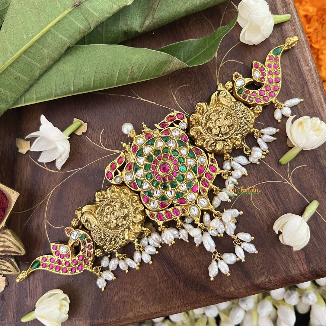 The Vriksham Designer Peacock Style Kundan Jadau Short Choker, adorned with delicate rice pearls, exemplifies refined artistry and elegance. Featuring intricate peacock motifs crafted with precision, this choker adds a timeless and sophisticated charm to your look, perfect for enhancing formal and festive attire.