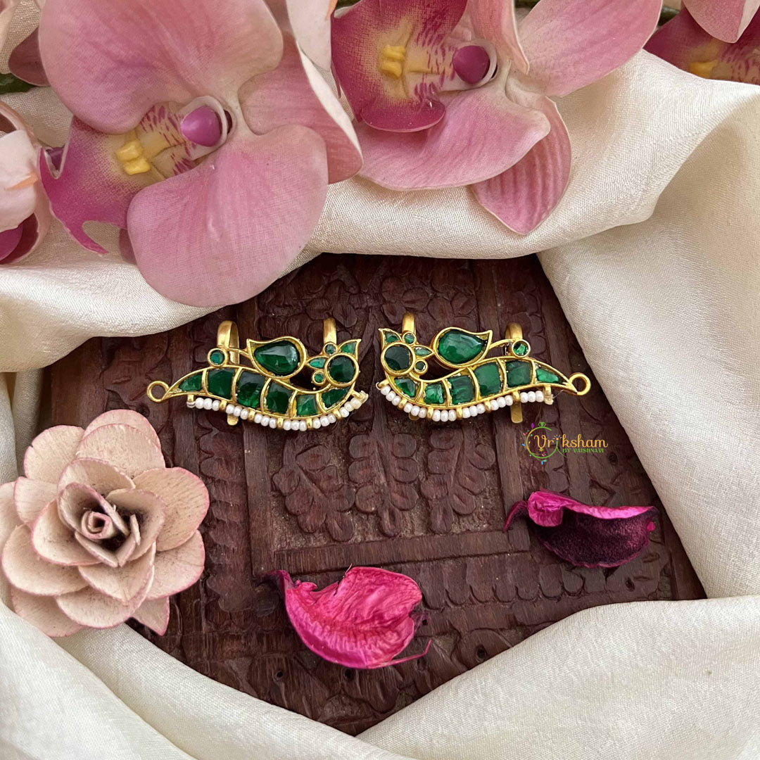 The Vriksham Designer Pearls Coted Peacock Green Emerald Style Kundan Jadau Press Bugadi features exquisite peacock motifs adorned with vibrant green emerald-like stones and delicate pearls. Crafted with meticulous Kundan Jadau techniques, this elegant piece offers a perfect blend of traditional artistry and refined sophistication, ideal for enhancing any special occasion ensemble.