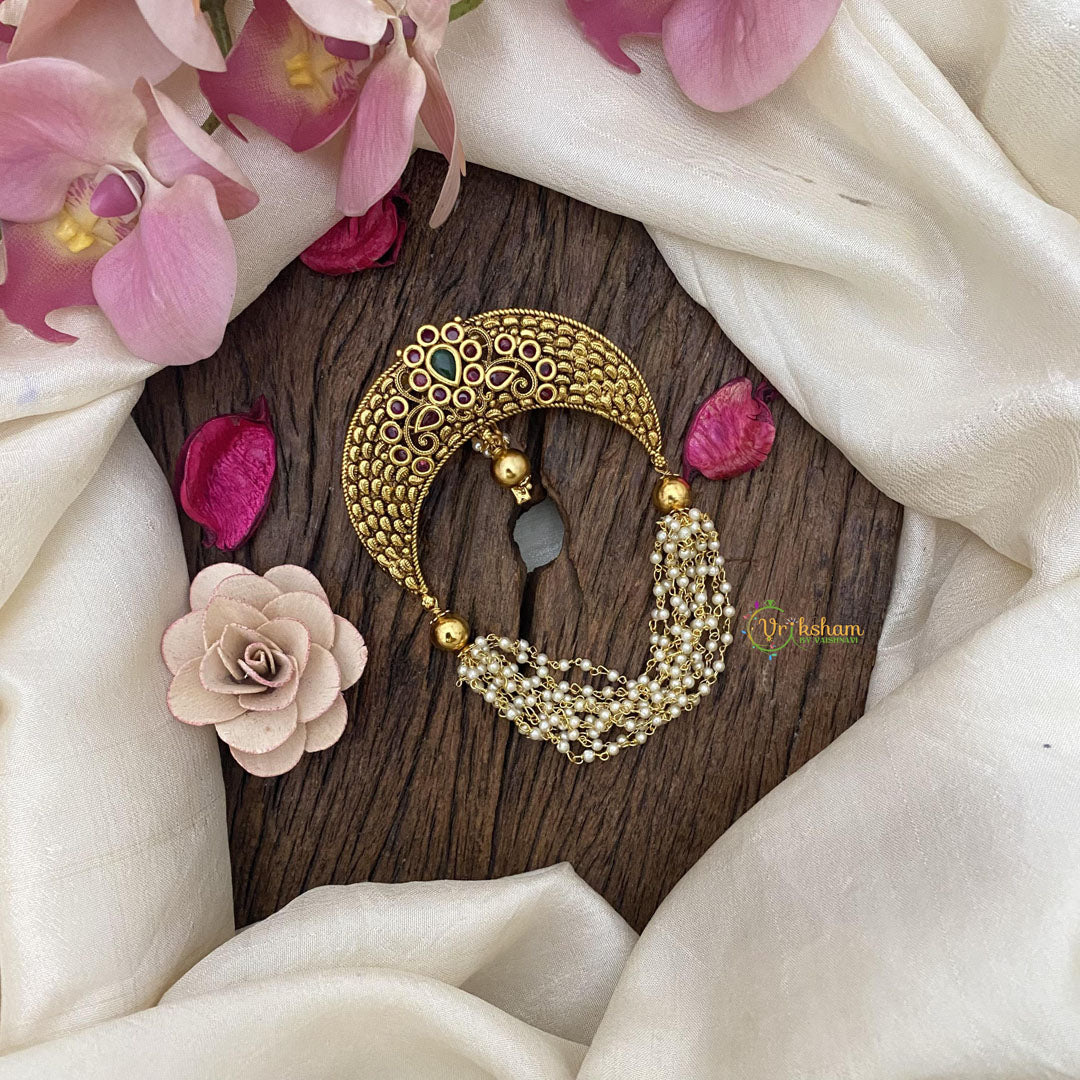 This exquisite Vriksham Designer Red Green Single Jada Billai-Pearls is a symbol of elegance and luxury. Adorned with delicate pearls, this jewel exudes sophistication and exclusivity. Designed to elevate any outfit, it is perfect for those who appreciate finer things in life.