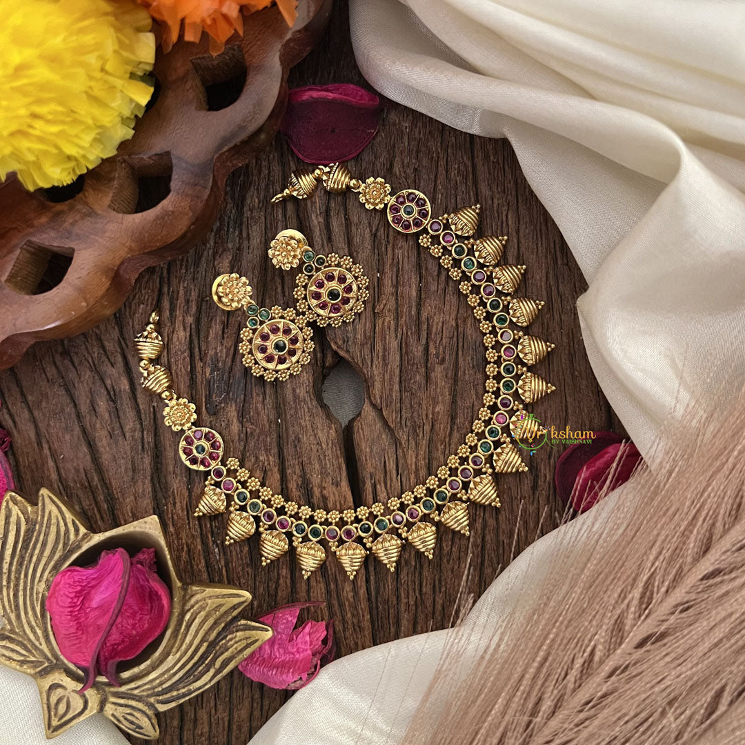 Elevate your style with the Vriksham Designer Red Green Stone Short Neckpiece. This stunning piece features vibrant red and green stones, crafted with exquisite detailing. Perfect for adding a touch of luxury to any outfit. Elevate your look with this exclusive accessory.
