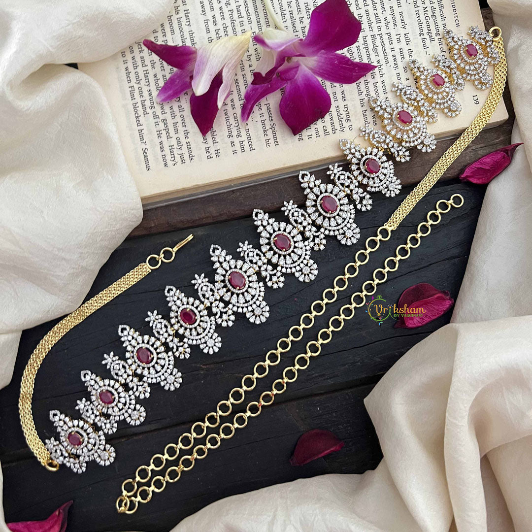 The Vriksham Designer Red Ruby Hipchain showcases intricate floral motifs adorned with radiant AD stones, creating a captivating blend of tradition and elegance. Crafted with precision, this piece brings a subtle yet sophisticated allure to your ensemble. The vibrant red rubies add a luxurious accent, making it an ideal choice for enhancing your look on special occasions with timeless grace.