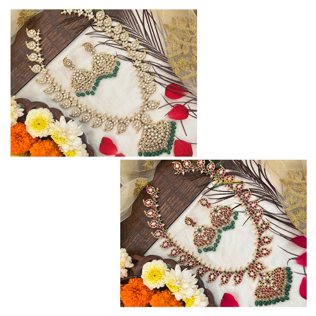The Vriksham Designer Reversible Manga Long Neckpiece features a versatile floral pendant paired with elegant green beads. This sophisticated piece offers reversible styling, blending traditional design with modern functionality to enhance your formal and festive wardrobe with grace and charm.