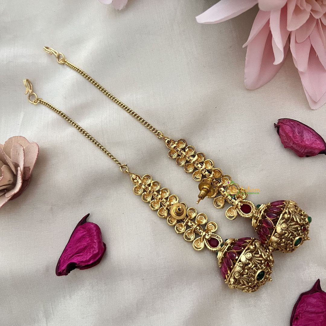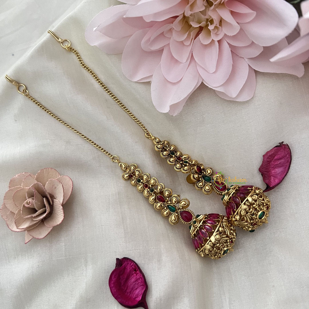 Artfully designed Round Jhumkas adorned with vibrant red green Maatil detailing. These sophisticated earrings showcase meticulous craftsmanship with their perfect circular form and rich crimson accents. The harmonious blend of traditional aesthetics and refined styling makes these jhumkas an exquisite addition to both heritage ensembles and contemporary attire.
