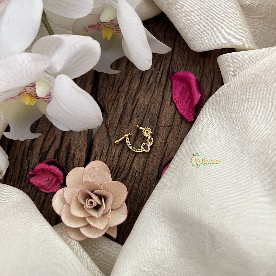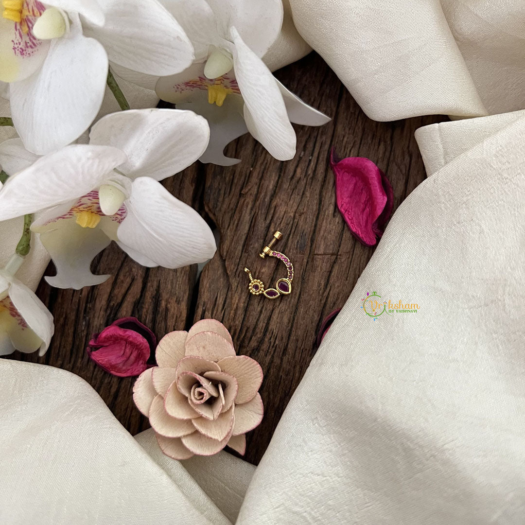 The Vriksham Designer Round Naths features a striking red design crafted into a classic round shape. This finely detailed nose pin blends traditional elegance with contemporary style, offering a sophisticated accessory that adds a bold yet refined touch to any ensemble.