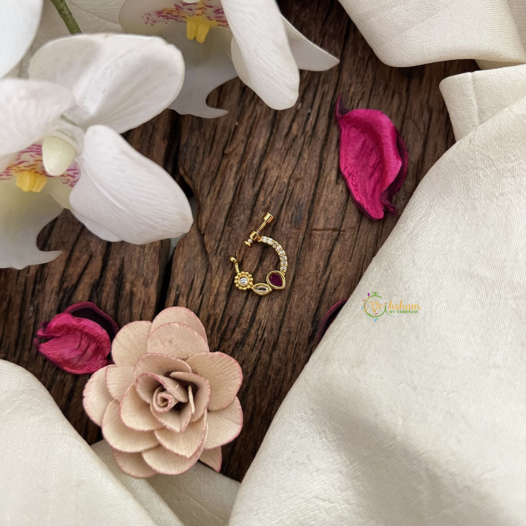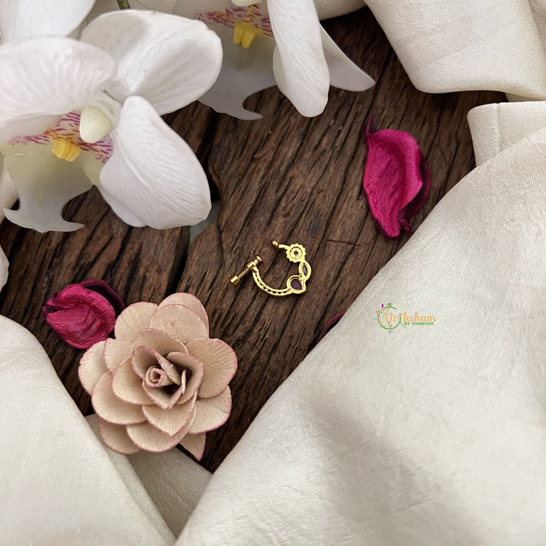 The Vriksham Designer Round Naths features a striking red white design crafted into a classic round shape. This finely detailed nose pin blends traditional elegance with contemporary style, offering a sophisticated accessory that adds a bold yet refined touch to any ensemble.