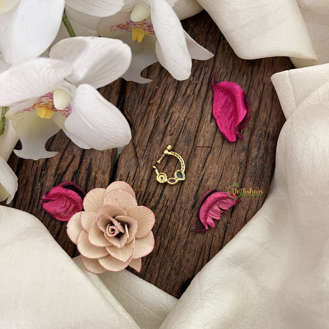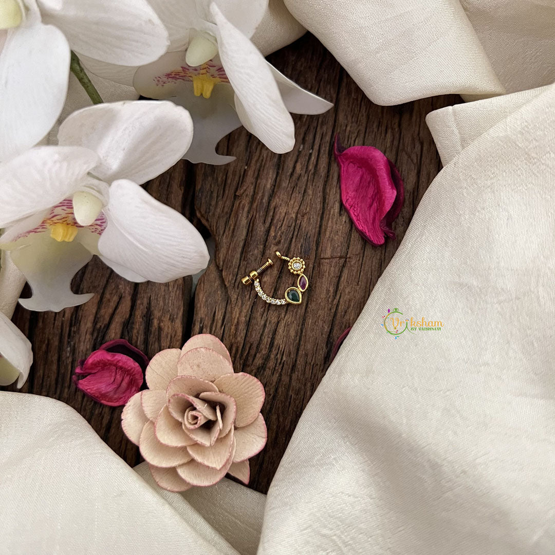 The Vriksham Designer Round Naths, designed for left nose wear, features a refined blend of red, white, and green hues in a classic round shape. Expertly crafted, this nose pin combines traditional elegance with modern sophistication, adding a subtle yet striking accent to elevate your ensemble.