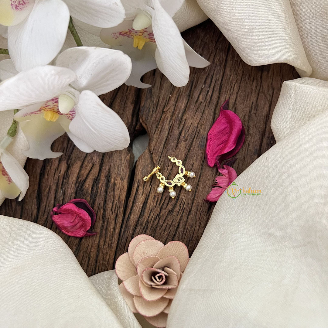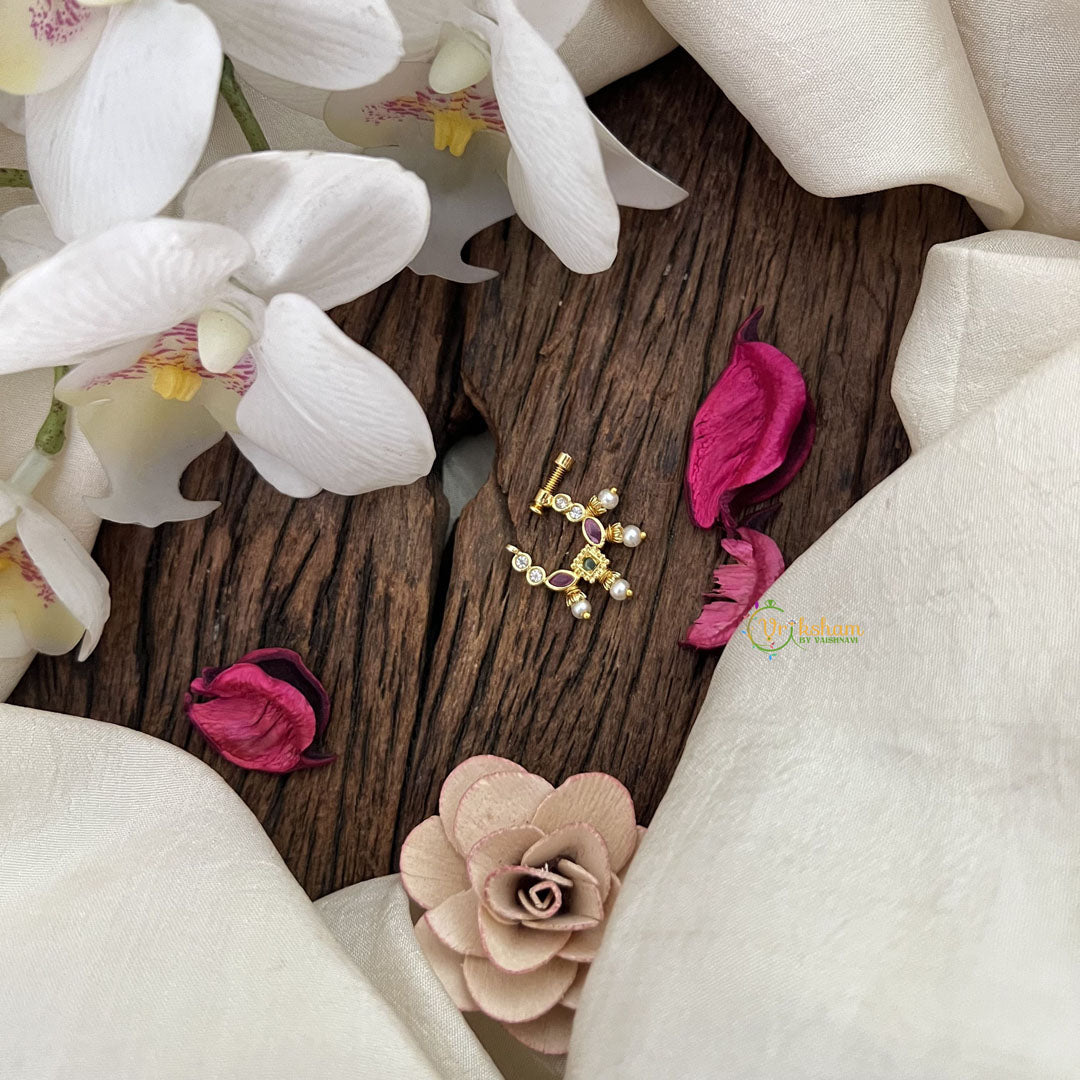 The Vriksham Designer Square Naths features a captivating blend of red, white, and green pearls arranged in a distinctive square design. This finely crafted nose pin merges traditional elegance with modern sophistication, making it an ideal accessory to elevate any ensemble. Its vibrant colors and unique shape offer a refined and memorable touch for those who value exquisite, standout jewelry.