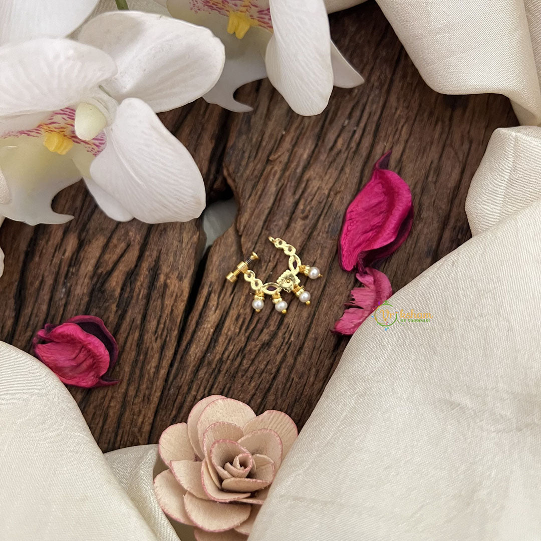 The Vriksham Designer Square Naths combines red and white pearls in a refined square design, blending classic elegance with contemporary style. This nose pin offers a sophisticated accent that enhances any ensemble with its delicate craftsmanship and timeless appeal, perfect for adding subtle grace to your look.