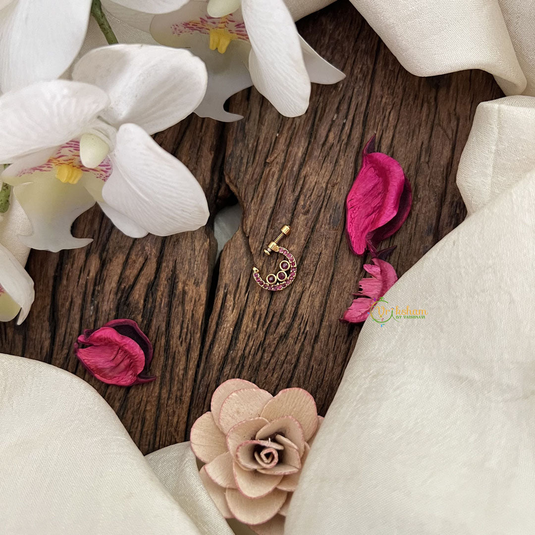The Vriksham Designer Three Dot Bridal Naths features an elegant combination of red accents arranged in a distinctive three-dot pattern. This finely crafted nose pin merges traditional design with modern sophistication, adding a graceful and subtle highlight to your bridal ensemble. Its precise detailing ensures a timeless accessory that complements your special day with refined charm.