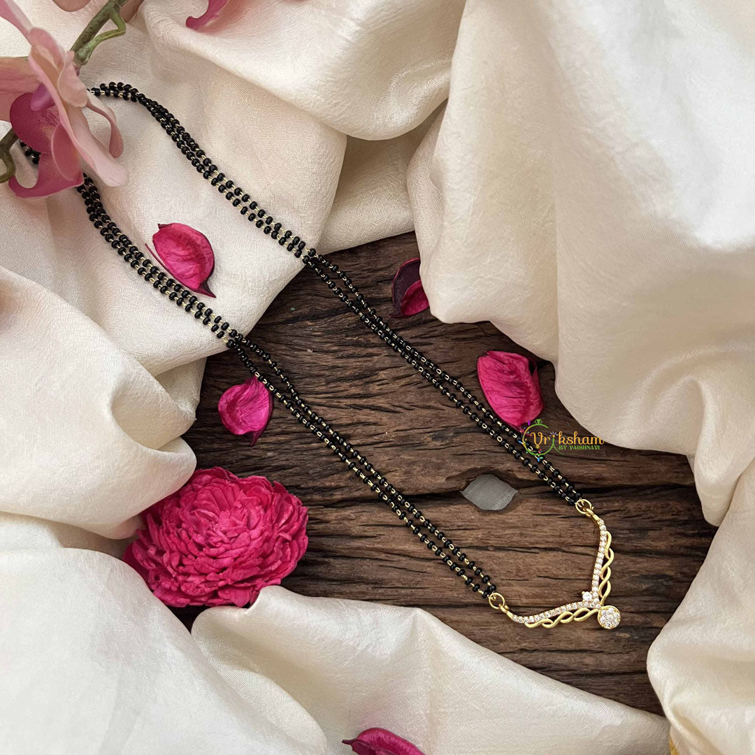The Vriksham Designer V-Shape Zigzag AD Stone Mangalsutra showcases a contemporary zigzag pattern accented with shimmering AD stones. Its distinctive V-shaped design offers a modern twist on tradition, perfectly suited for those who appreciate understated sophistication and elegant craftsmanship in their jewelry.