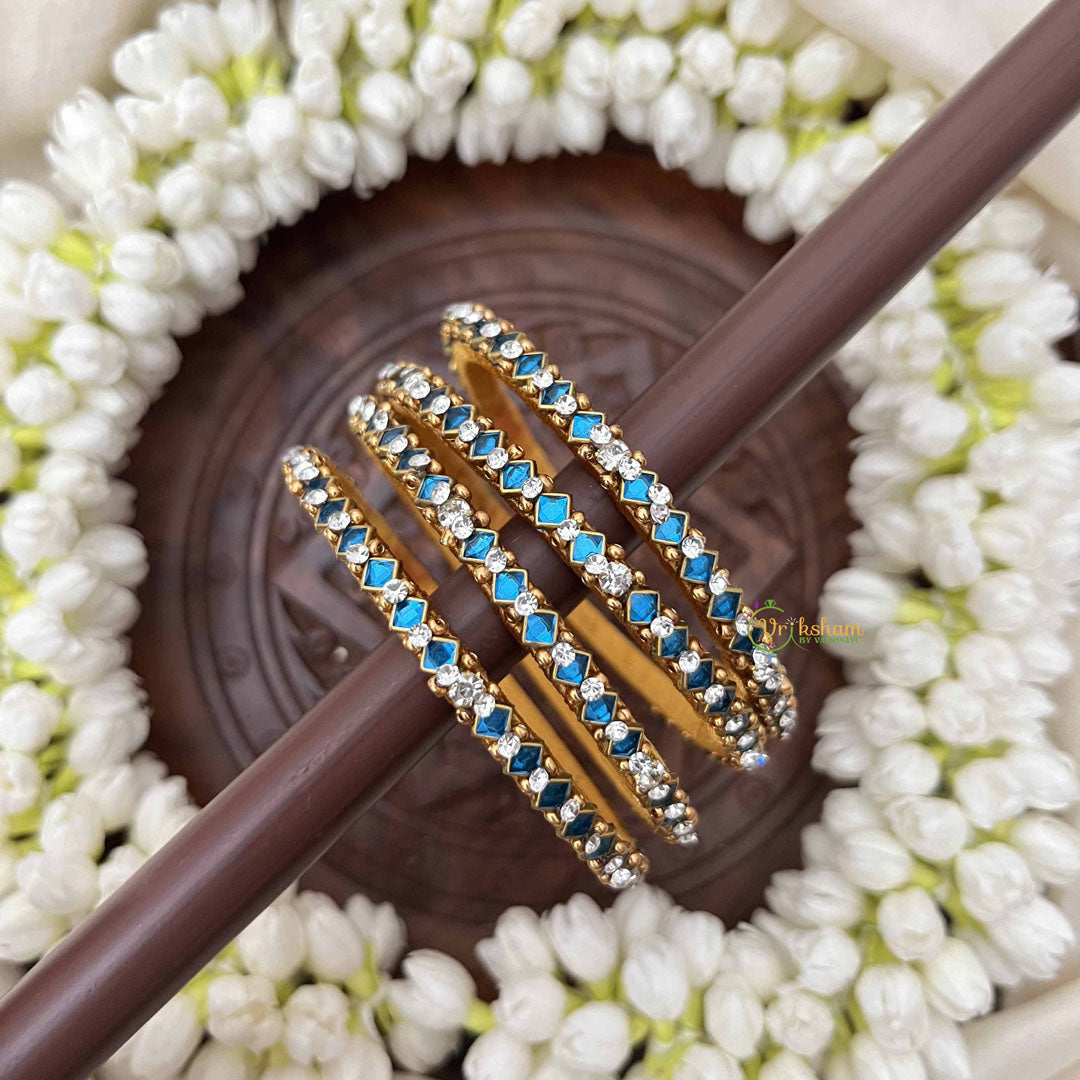 Elevate your wrist with these exquisite kundan bangles, where traditional craftsmanship meets contemporary design. Featuring a striking diagonal dot pattern in serene blue and white hues, each bangle is meticulously adorned with lustrous kundan stones that catch the light beautifully. The silk thread base ensures comfort and durability for everyday wear or special occasions. Perfect for adding a touch of refined elegance to any ensemble, these bangles celebrate timeless Indian artistry with a modern aesthetic sensibility.