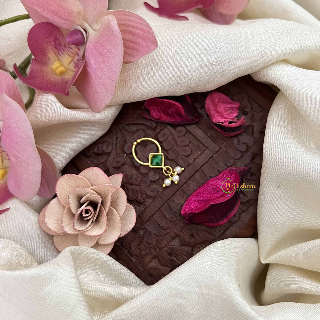 This diagonal style gold-toned Kundan Jadau septum ring showcases a harmonious blend of traditional craftsmanship and modern elegance. Adorned with delicate green pearls, it offers a subtle yet striking accent that complements any outfit. A refined accessory designed to enhance your look with timeless sophistication.