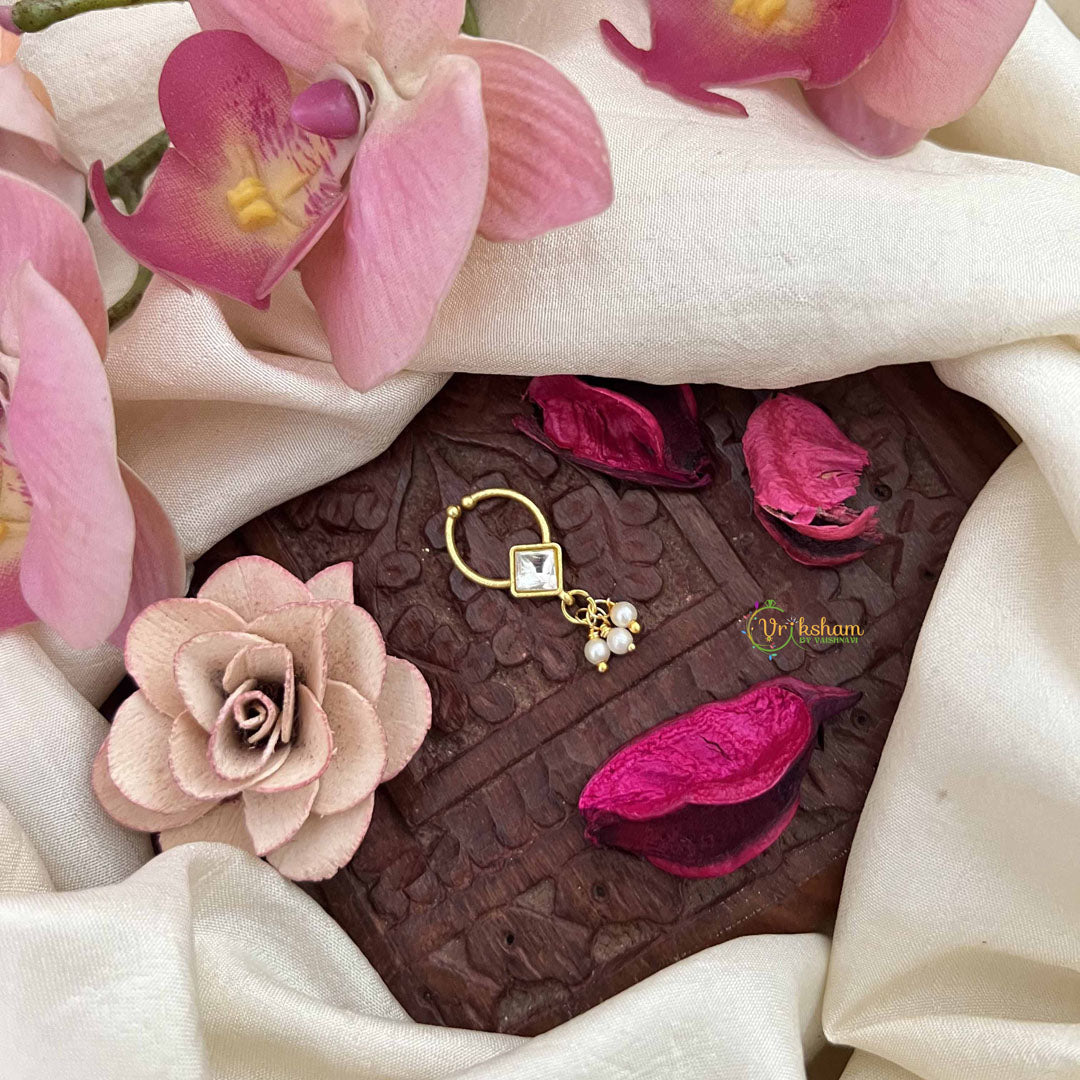 The Vriksham Diagonal Style Gold-Toned Kundan Jadau Septum Ring, accented with white pearls, showcases elegant craftsmanship with intricate kundan detailing in a warm gold tone. Its distinctive diagonal design adds a contemporary flair, making it a sophisticated accessory to elevate traditional attire with subtle refinement.