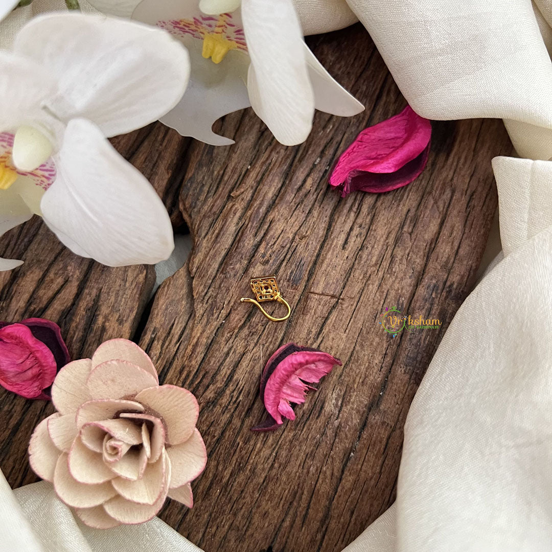 The Vriksham Diamond Shape Golden Naths in multi-color features a striking geometric design adorned with vibrant hues, all set in a luxurious golden finish. This sophisticated nose pin blends bold colors with refined craftsmanship, adding a timeless and elegant accent to traditional attire.