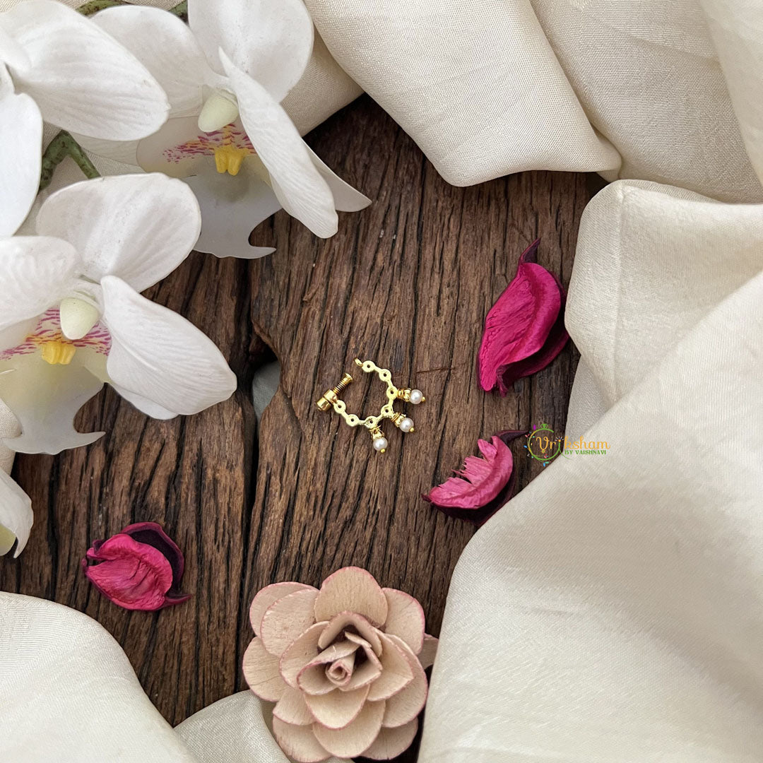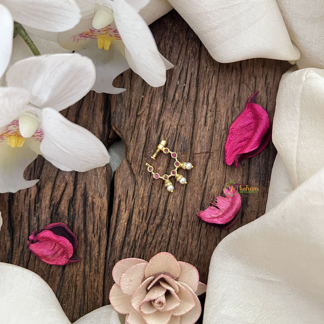 The Vriksham Designer Golden Nath with a striking red pearl offers a perfect blend of tradition and modern elegance. Crafted with precision, this nose pin adds a vibrant yet refined accent to your ensemble, enhancing your style with subtle sophistication. Ideal for elevating both everyday and festive looks.