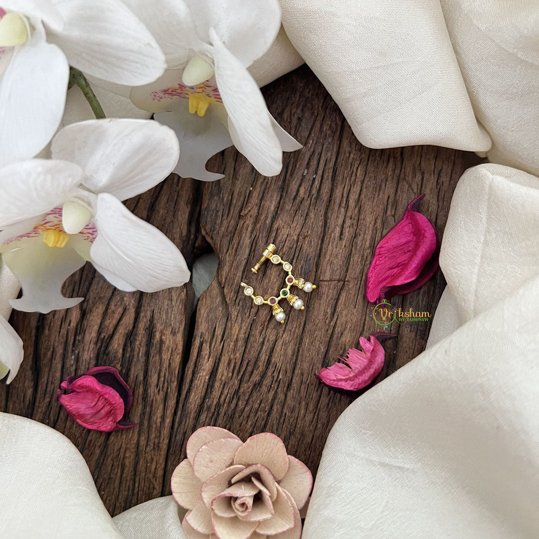 The Vriksham Designer Golden Nath adorned with red, white, and green pearls offers a refined fusion of vibrant hues and classic design. This elegant nose pin adds a sophisticated splash of color, perfect for enhancing your ensemble with subtle yet striking charm.