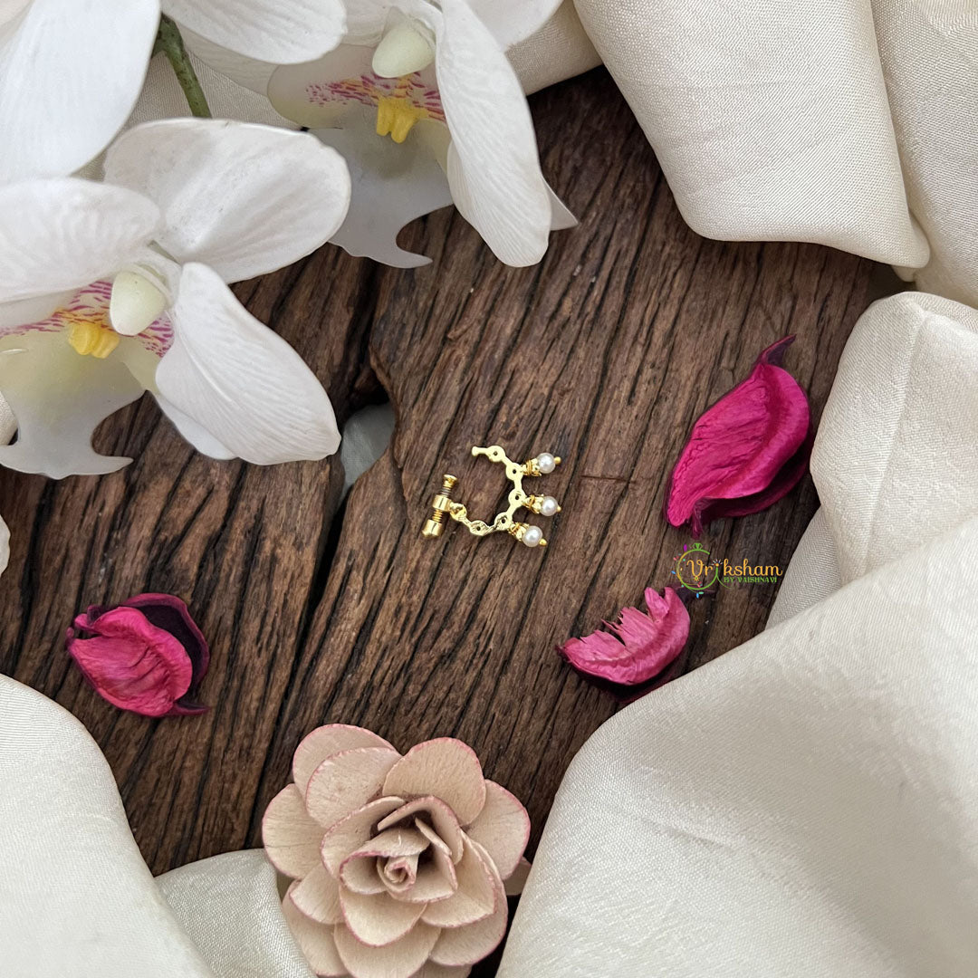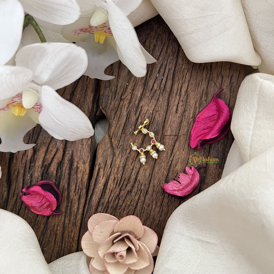 The Vriksham Designer Golden Nath featuring a harmonious blend of red and white pearls embodies timeless elegance. This exquisitely crafted nose pin enhances your look with a delicate balance of color and sophistication, perfect for adding a graceful touch to any occasion.