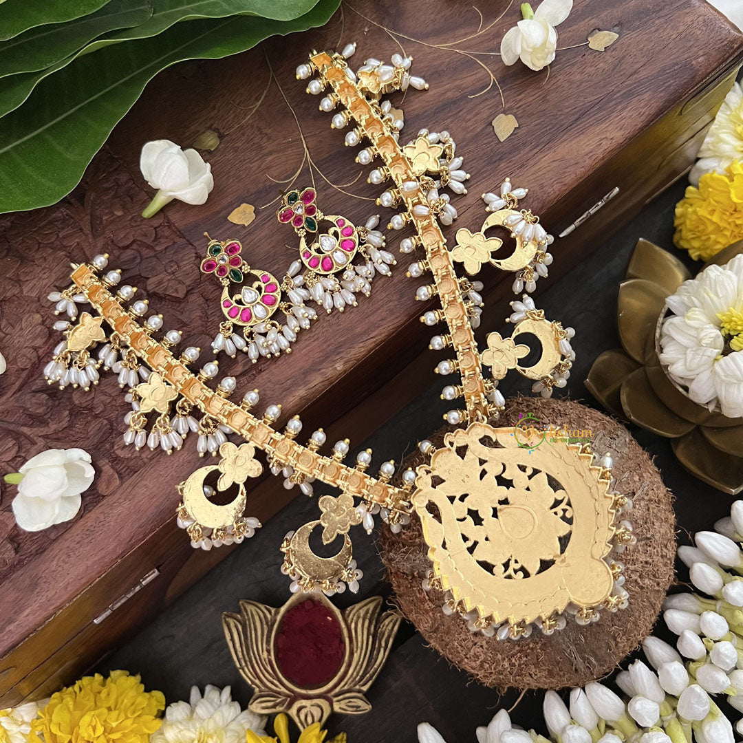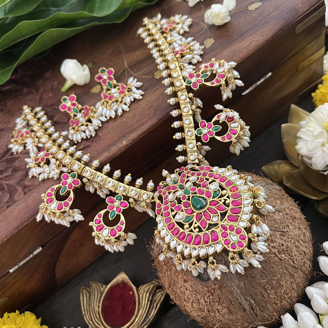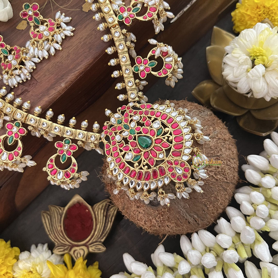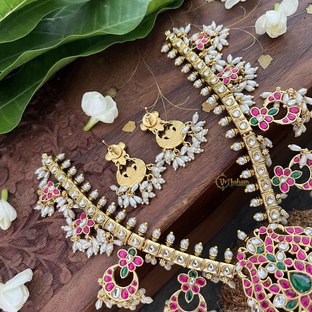 The Vriksham Diva Style Kundan Jadau Neckpiece features a refined combination of red and white stones accented with delicate rice pearls. This sophisticated piece showcases intricate craftsmanship, offering a timeless accessory that adds elegance and subtle charm to your formal attire.