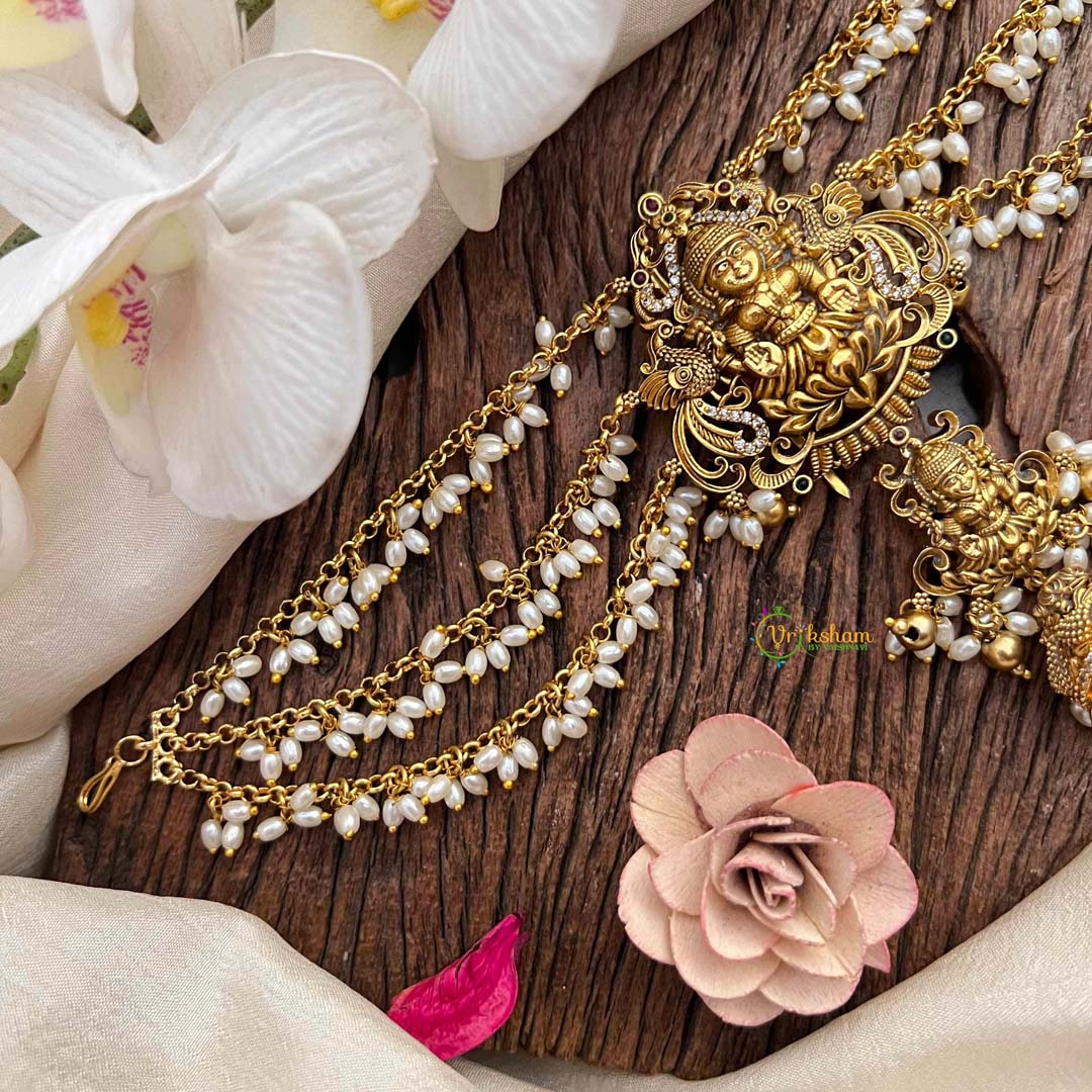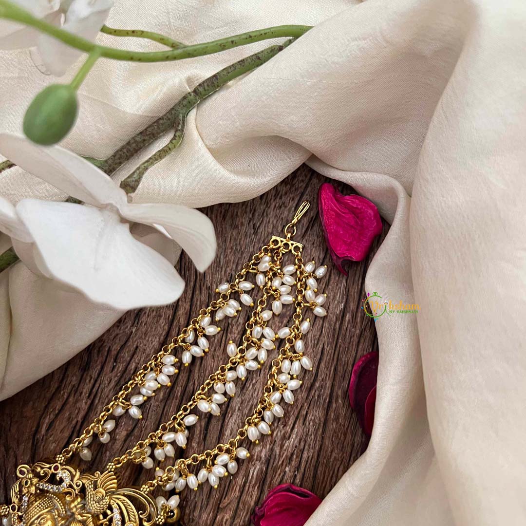 Embrace timeless elegance with this exquisite temple jada billai, a masterpiece of traditional craftsmanship. Featuring a divine god motif at the center, this ornament is adorned with triple pearl side chains that cascade gracefully, adding movement and luminosity to your appearance. Meticulously designed for those who appreciate refined jewelry, it seamlessly blends spiritual symbolism with sophisticated aesthetics. Perfect for festivals, celebrations, or everyday wear, this piece elevates your traditional ensemble with understated luxury and cultural grace.