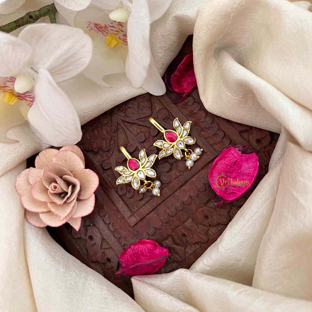 Illuminate your elegance with this Diya & Floral Style Kundan Jadau Bugadi, a luminous celebration of tradition and artistry in white and red. The symbolic diya motif, intertwined with delicate floral elements, creates a narrative of light and prosperity rendered through exquisite Kundan craftsmanship. Cascading pearl drops add movement and dimension, catching light with mesmerizing brilliance. The balanced white and red palette evokes both festive joy and refined sophistication, making this piece ideal for weddings, celebrations, and auspicious occasions. Each detail reflects meticulous artisanal execution, with authentic Jadau techniques ensuring lasting beauty and structural integrity. A meaningful accessory that honors cultural heritage while delivering contemporary elegance, this bugadi stands as a treasured investment in timeless grace.
