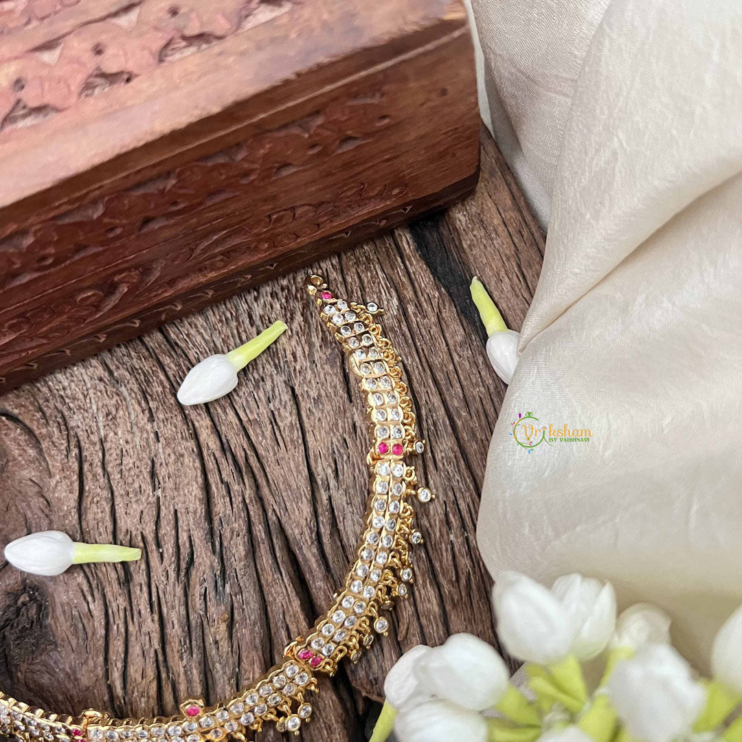 Illuminate your elegance with this exquisite Diya Pendant Short Neckpiece, a harmonious blend of traditional symbolism and contemporary design. Adorned with sparkling diamond drops in pristine white and rich red tones, this neckpiece captures the essence of timeless beauty. The carefully crafted pendant features a graceful diya motif, while the diamond embellishments add a luxurious shimmer that catches light with every movement. Perfect for festive occasions, celebrations, or elevating your everyday sophistication, this short neckpiece offers versatile styling that complements both traditional and modern ensembles. A refined choice for those who appreciate jewelry that tells a story of cultural heritage and refined taste.