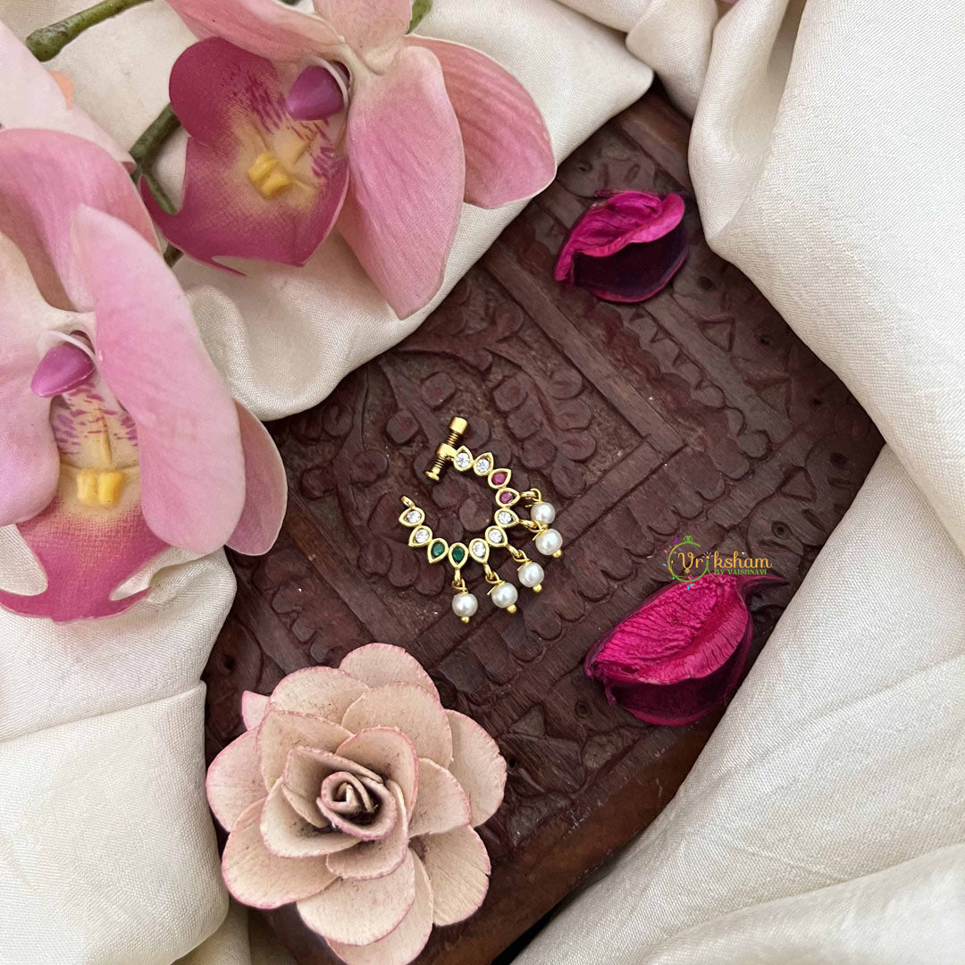 The Vriksham Diya Shape Press Naths in red, green, and white pearls features an elegant diya-inspired design accented with luminous pearls. Crafted for a secure and comfortable fit, this nose pin adds a graceful and vibrant touch, perfect for enhancing both traditional and contemporary ensembles with refined sophistication.