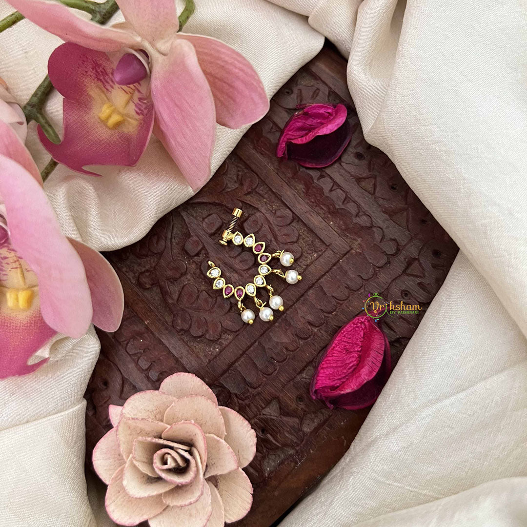 The Vriksham Diya Shape Press Naths in red and white pearls showcases a refined diya-inspired design embellished with radiant pearls. Designed for a secure and comfortable wear, this nose pin offers a stylish and elegant accent, ideal for elevating both traditional and modern outfits with subtle sophistication.
