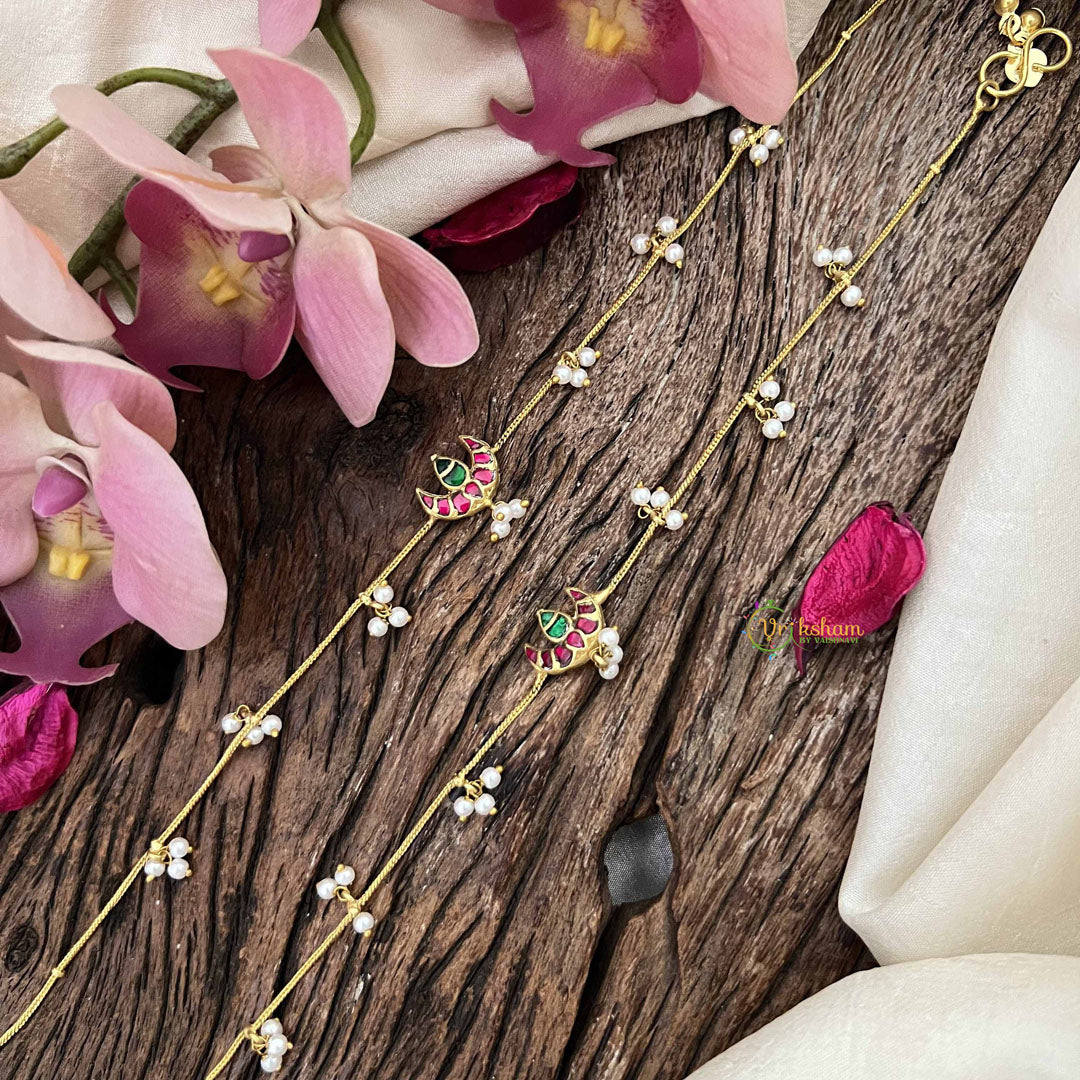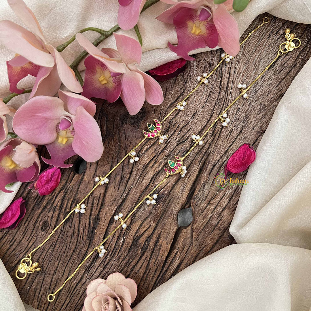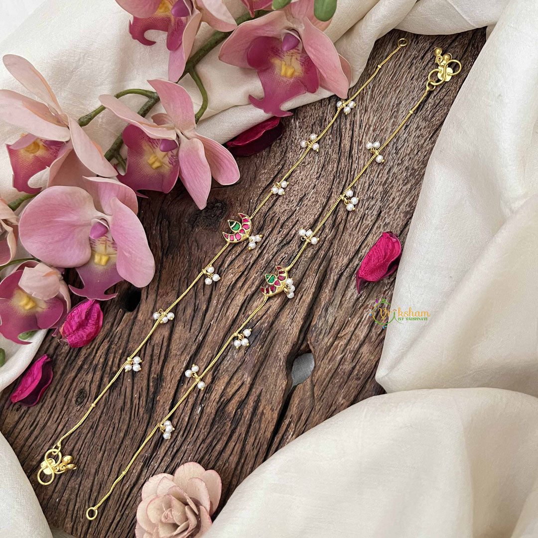 Illuminate your style with these exquisite Diya Style Gold Look Alike Pearls Drop Anklets in rich red and green tones. Inspired by the sacred lamp motif, each anklet showcases intricate detailing with luminous pearl embellishments that create a mesmerizing play of light. The gold-toned finish enhances the spiritual elegance of the design, making these anklets ideal for festive celebrations and cultural occasions. Thoughtfully crafted for comfort and lasting wear, they represent a beautiful fusion of traditional symbolism and contemporary jewelry artistry, adding meaningful sophistication to your personal adornment.