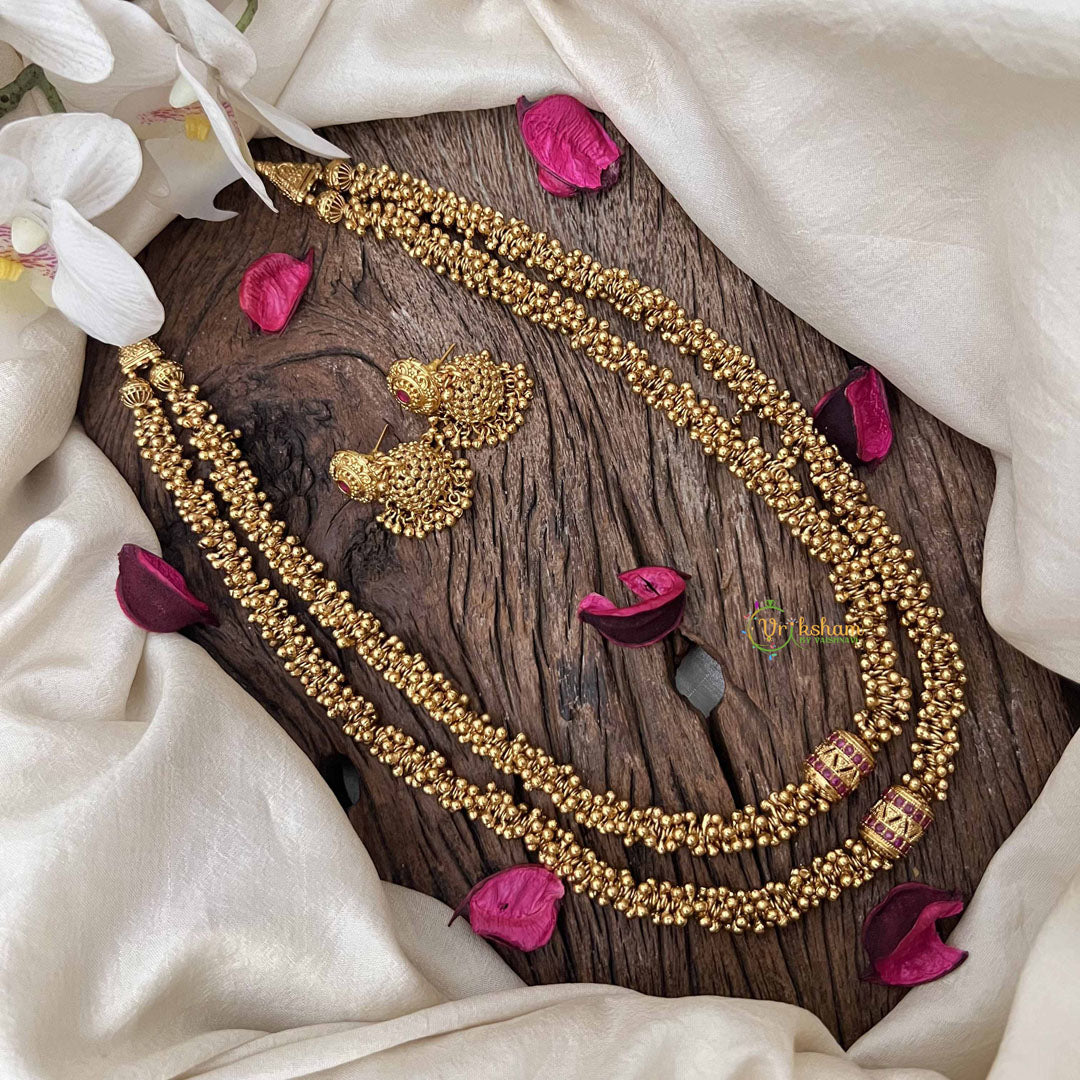 The Vriksham Double Layer Antique Gold Beaded Neckpiece in red features a layered design that blends antique gold tones with vibrant red beads. This sophisticated piece adds depth and richness to your ensemble, making it an elegant choice for traditional and festive occasions.