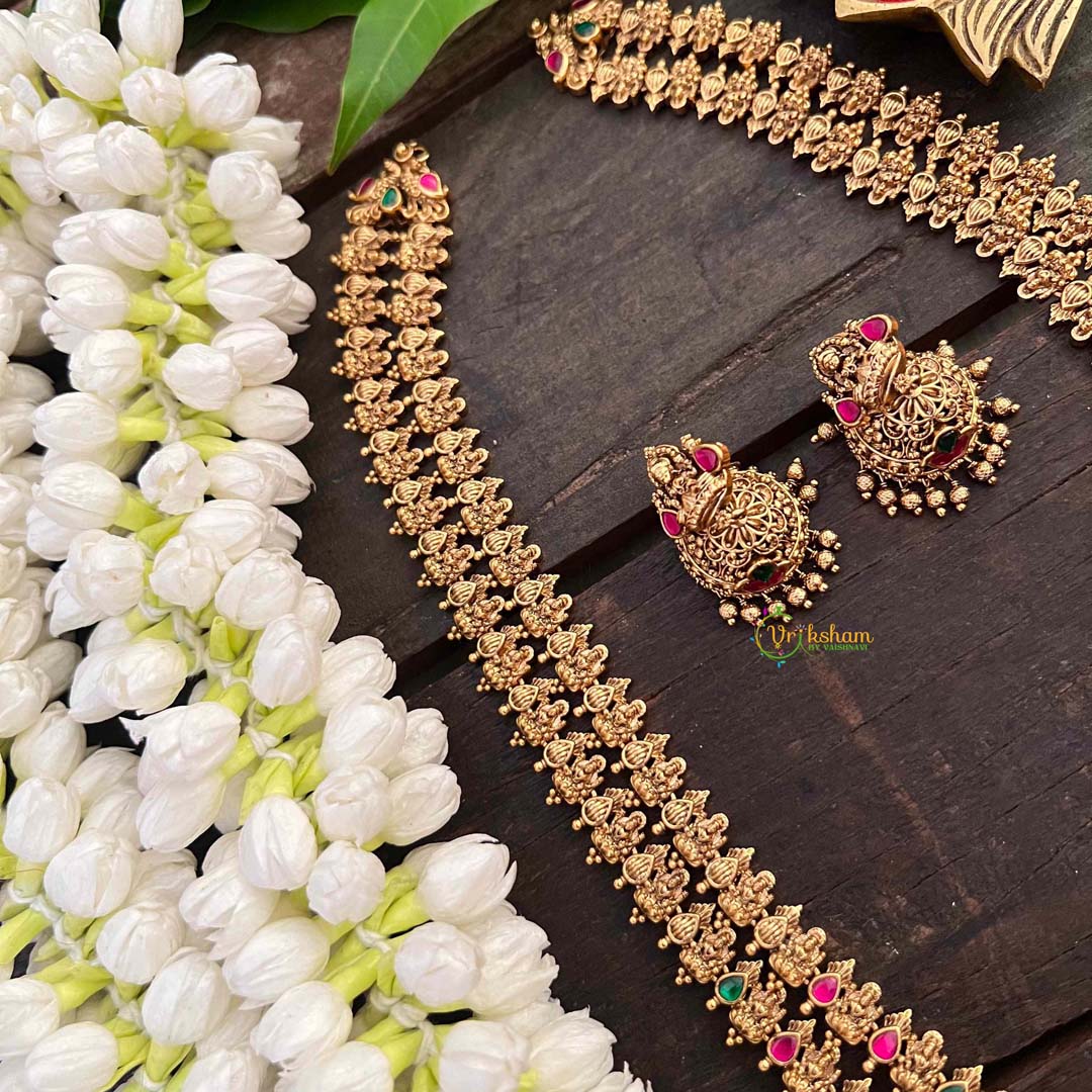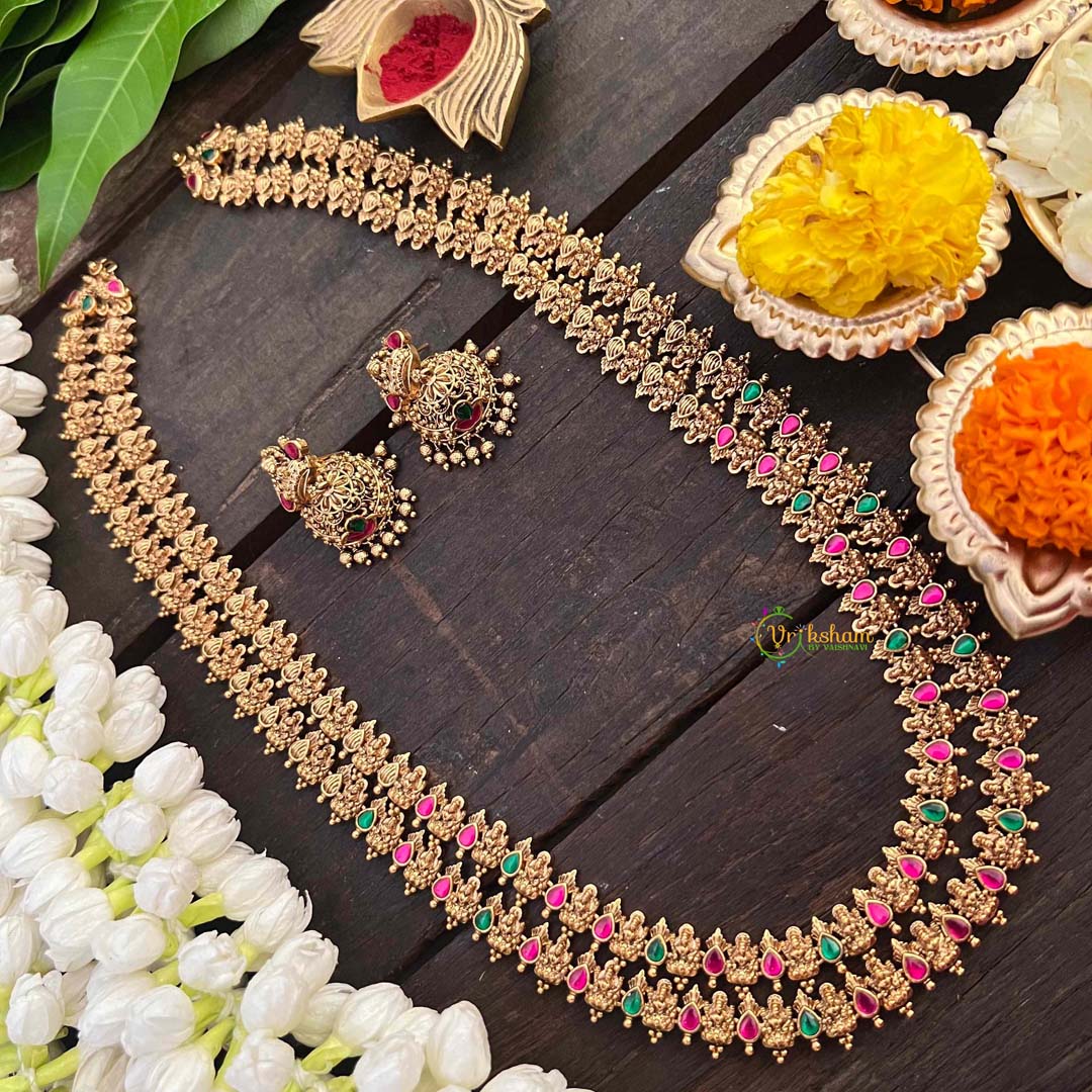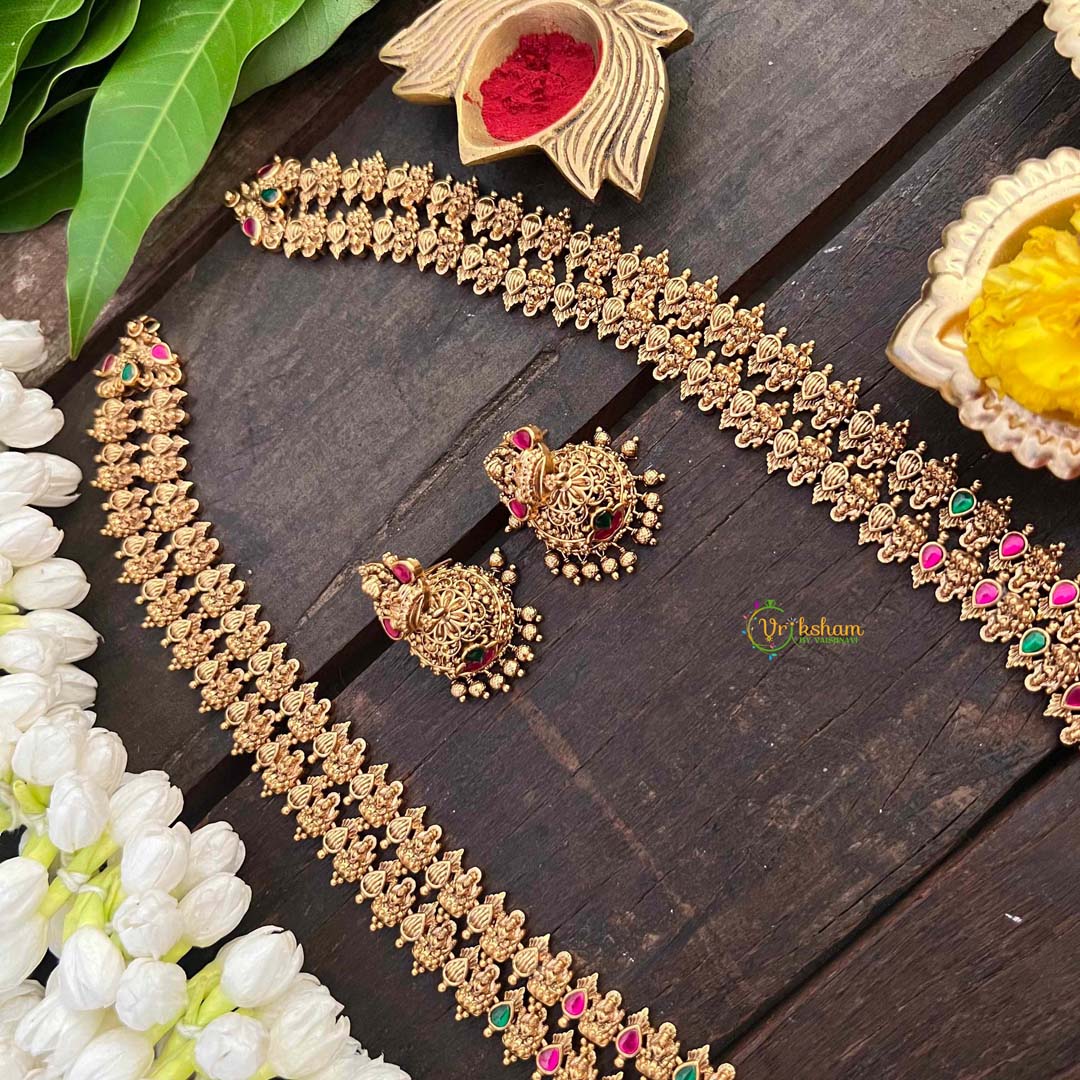 The Vriksham Double Layer Gold Plated Lakshmi Necklace features an intricate Lakshmi pendant complemented by delicate leaf motifs in a rich double-layer design. Enhanced with vibrant red and green beads, this sophisticated long neckpiece beautifully blends traditional elegance with refined craftsmanship, making it an exquisite choice for special occasions.