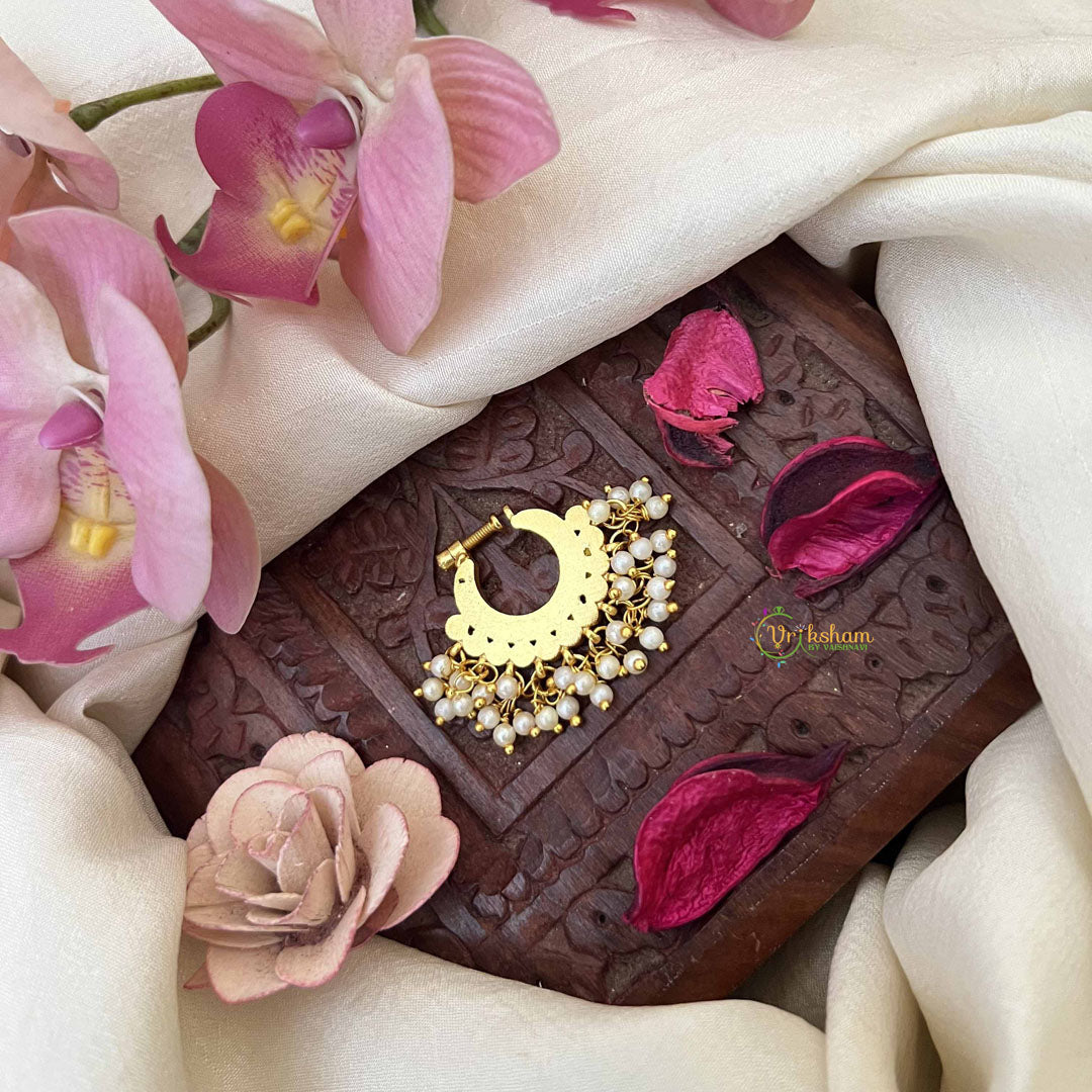 The Vriksham Double Layered Chand Bali Style Nath features lustrous white stones and pearls set in intricate Jadau craftsmanship. Its double-layered design adds depth and elegance, while the press-fit ensures comfortable, secure wear—an exquisite choice to elevate any traditional ensemble.