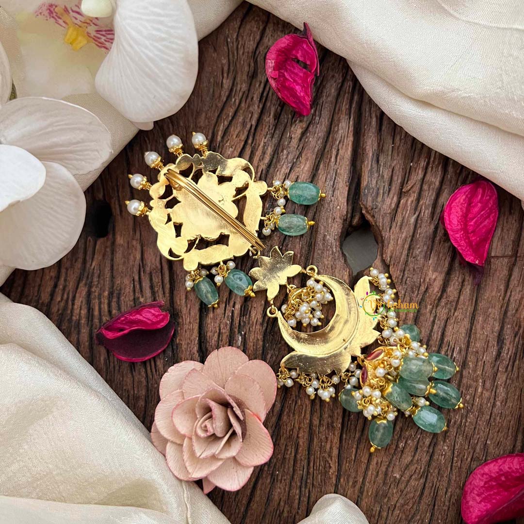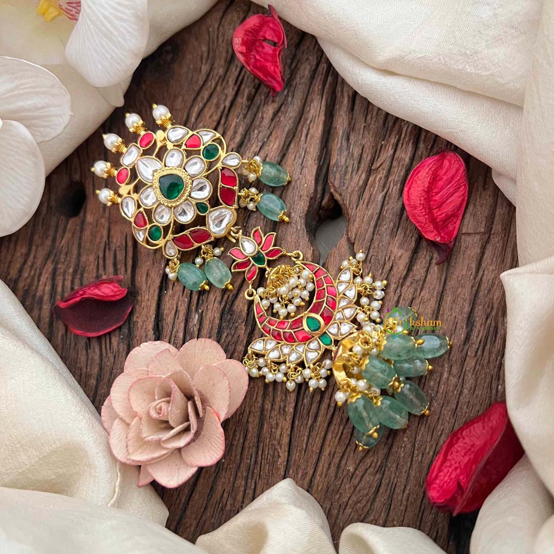 Discover the timeless allure of this Double Pendant Chandbali Style Kundan Jadau creation. Each pendant showcases intricate gemstone inlay work featuring rich red, verdant green, and pristine white stones, enhanced with elegant green beading and lustrous pearls. The Chandbali design—inspired by the crescent moon—reflects centuries of Indian jewelry heritage and unparalleled craftsmanship. This sophisticated piece seamlessly transitions from festive celebrations to refined everyday elegance, offering a harmonious blend of traditional artistry and contemporary grace. An investment in heirloom-quality jewelry that celebrates your refined aesthetic.