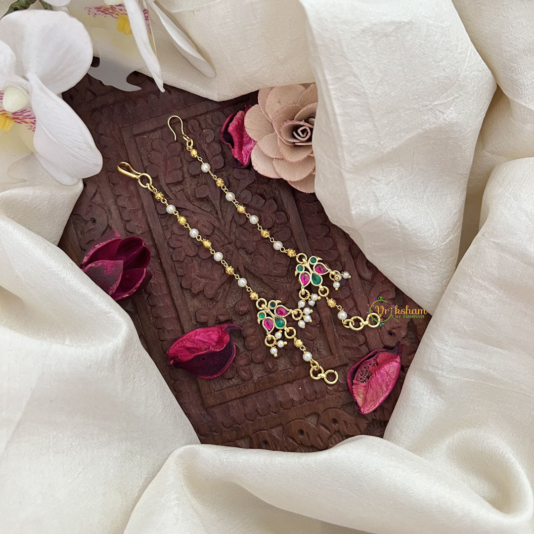 Indulge in the elegance and exclusivity of Vriksham's Dual Bird Single Strand Kundan Jadau Pearl Maatil. Adorned with stunning red and green accents, this piece exudes sophistication and luxury. Enhance any outfit with this premium product, perfect for those who appreciate the finer things in life.