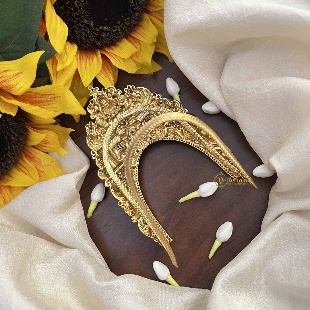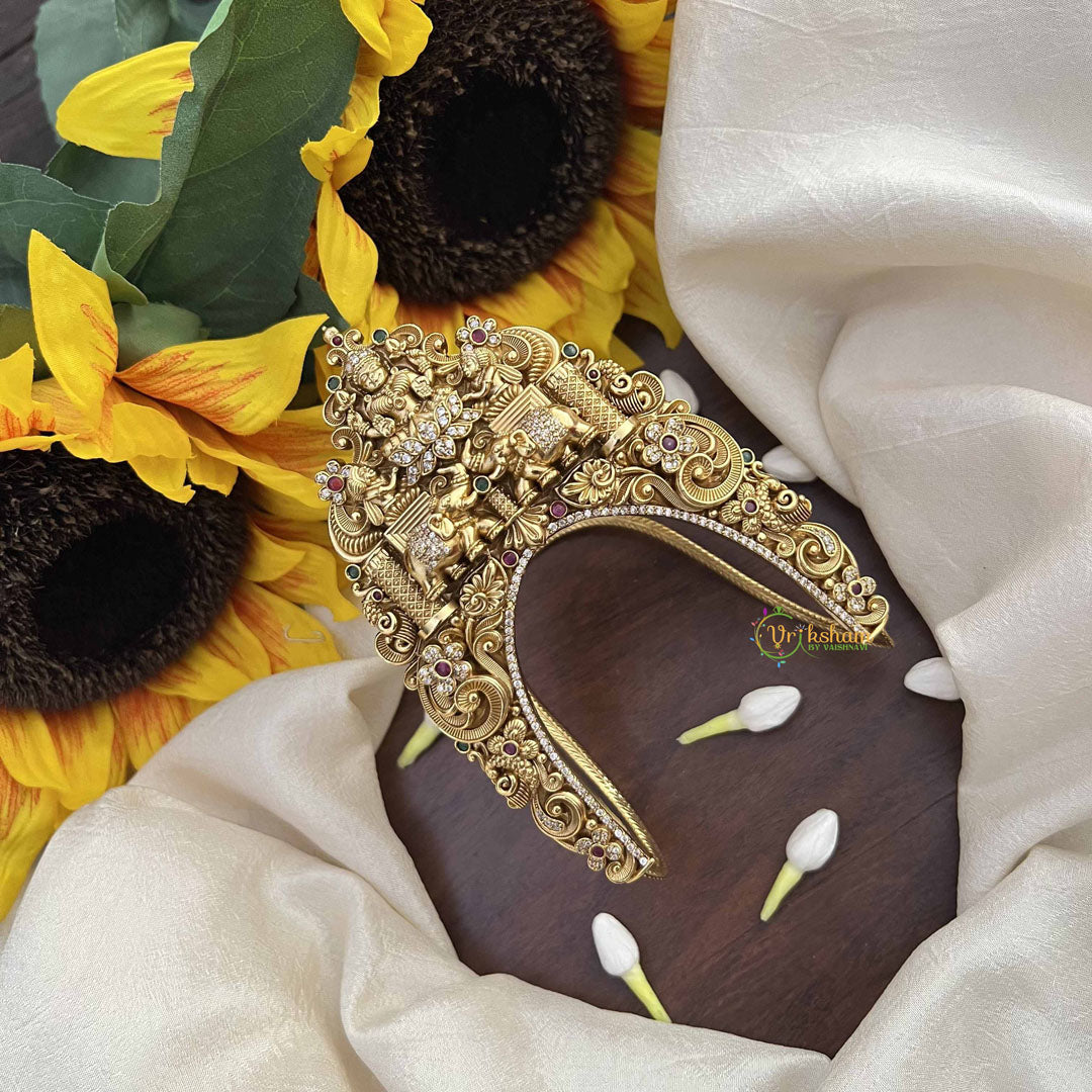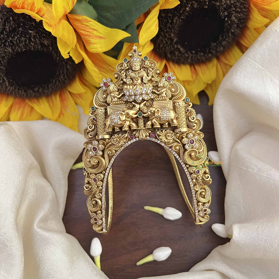 Celebrate balanced prosperity with this Dual Elephant Lakshmi Floral Style Vanki Armlet, a harmonious composition of strength, grace, and abundance. Two majestic elephants, symbols of wisdom and good fortune, frame Goddess Lakshmi in an elegant floral setting that honors both power and beauty. The intricate botanical motifs create a lush, refined aesthetic that celebrates nature's artistry while invoking divine blessings. This thoughtfully designed armlet merges the elephant's noble presence with Lakshmi's benevolent energy, creating a powerful spiritual talisman for those seeking prosperity and protection. The sophisticated craftsmanship ensures this piece transitions seamlessly from daily devotional practice to significant religious celebrations. Perfect for those who appreciate symbolic depth and refined design, this armlet serves as a meaningful expression of spiritual consciousness and cultural authenticity. An invaluable addition to your jewelry collection, it honors the goddess of wealth while making a graceful statement of timeless elegance and devotional commitment.