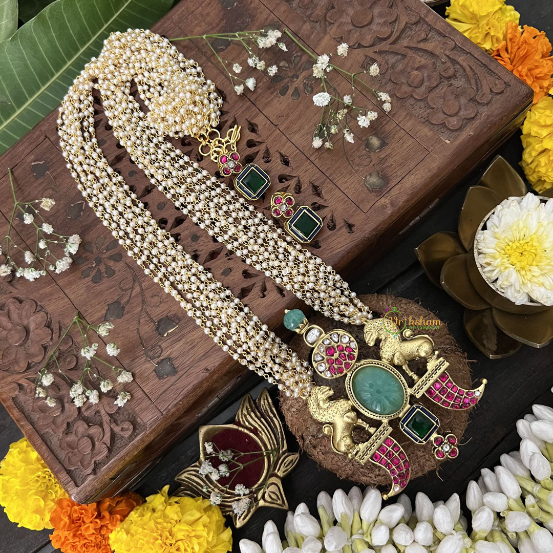 The Vriksham Dual Lion Face Pendant Jadau Kundan Layered Mala in red, green, and white features a striking pendant with intricately detailed lion faces, symbolizing strength and elegance. Crafted with traditional Jadau and Kundan techniques, this sophisticated layered mala combines vibrant colors and bold design to elevate your special occasion ensemble with regal charm.