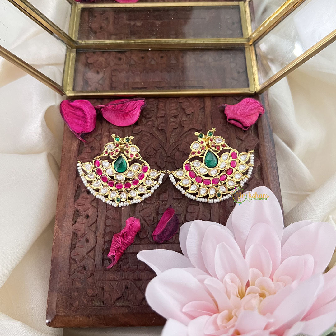 Exquisite Dual Peacock Chandbali earrings featuring an elegant red green and white color palette. These statement pieces blend traditional Indian artistry with contemporary sophistication. The distinctive peacock motifs symbolize beauty and grace, while the classic Chandbali silhouette offers timeless appeal. Perfect for elevating both festive attire and modern ensembles with refined cultural elegance.