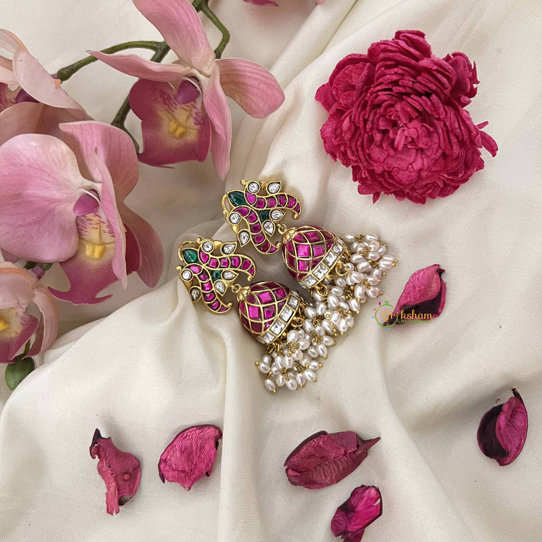 The Vriksham Dual Peacock Jadau Jhumkas feature exquisite dual peacock motifs adorned with vibrant red, green, and white accents. Enhanced by delicate rice beads, these earrings embody intricate craftsmanship and timeless elegance, making them a perfect choice for sophisticated occasions.