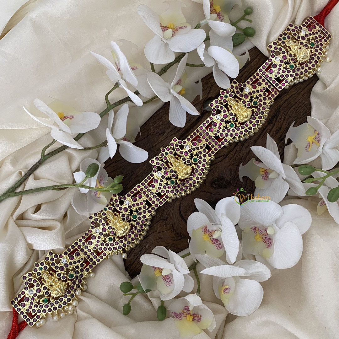 Elevate your traditional attire with the Vriksham Dual Peacock Lakshmi Kemp Hipbelt-Pearl. Crafted with intricate detail, this hand-crafted hipbelt features dual peacock designs symbolizing beauty and grace. Adorned with pearls and kemp stones, it adds a touch of luxury and elegance to any outfit. Make a statement with this exclusive accessory.